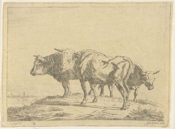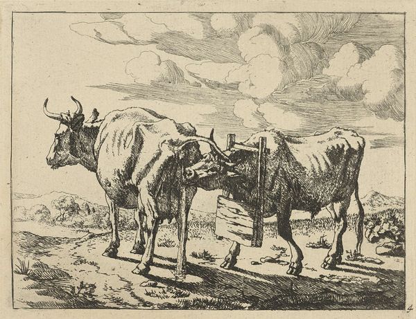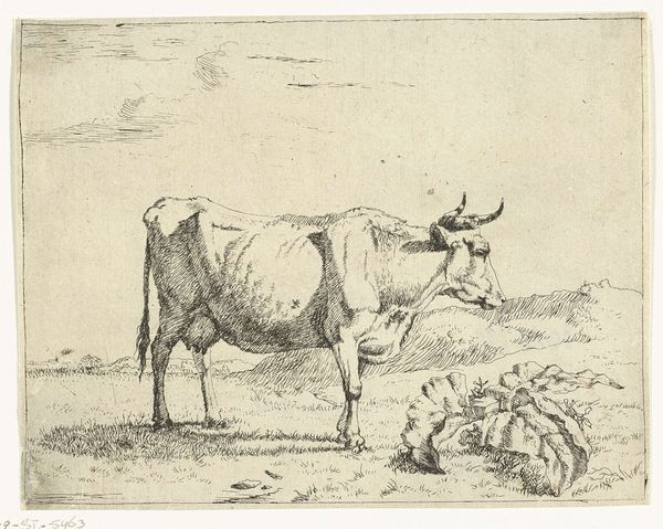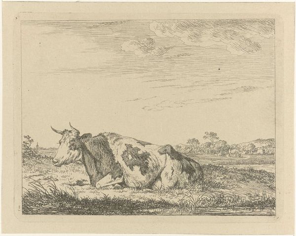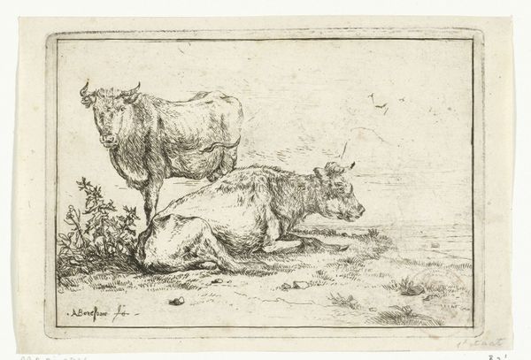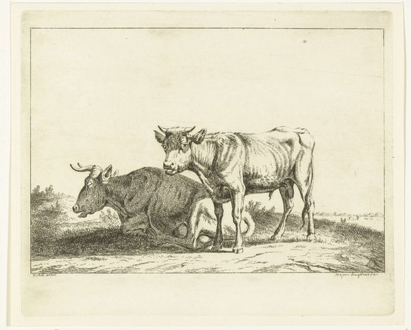 Editor: This drawing, titled "Weiland met een staande en liggende koe" which translates to "Pasture with a standing and reclining cow," was created sometime between 1792 and 1810 by Wouter Johannes van Troostwijk. It's a pencil and charcoal drawing. I'm immediately struck by how…peaceful it is, in a very quiet, unassuming way. What do you see in this piece? Curator: The cows, rendered so realistically, almost become symbols of the Dutch landscape itself. Consider the cultural memory embedded within such an image. Cows represent sustenance, prosperity, and a connection to the land. Troostwijk's choice of subject matter evokes a sense of national identity and agrarian pride. Do you find a connection between the mundane subject matter and any deeper cultural meanings? Editor: I hadn't considered the cows as symbols of Dutch identity, but now that you mention it, it makes perfect sense. It's a very…Dutch scene. The quietness takes on new meaning too; maybe it's a peaceful pride? Curator: Exactly! And notice how the artist captures the texture and form using such simple materials – charcoal and pencil. The realism, down to the musculature and even the shadows cast, anchors these animals to a particular time and place. This artistic choice itself points towards a broader cultural value placed on observational accuracy during that period. Think of Dutch Golden Age paintings and the detail afforded everyday life. What kind of story do you think the artist wanted to convey? Editor: Maybe he wasn't trying to convey any grand story at all, but just capturing the quiet dignity of everyday life? He simply wanted to offer us a scene of cows as part of their surroundings, to give that value to them. I now wonder if his choices represent his cultural roots too. Curator: It's a profound shift in perspective, isn’t it? This simple pastoral scene really reflects complex layers of meaning once we consider cultural symbols and visual history. Editor: Yes! Thank you so much, I can’t look at cows the same way.