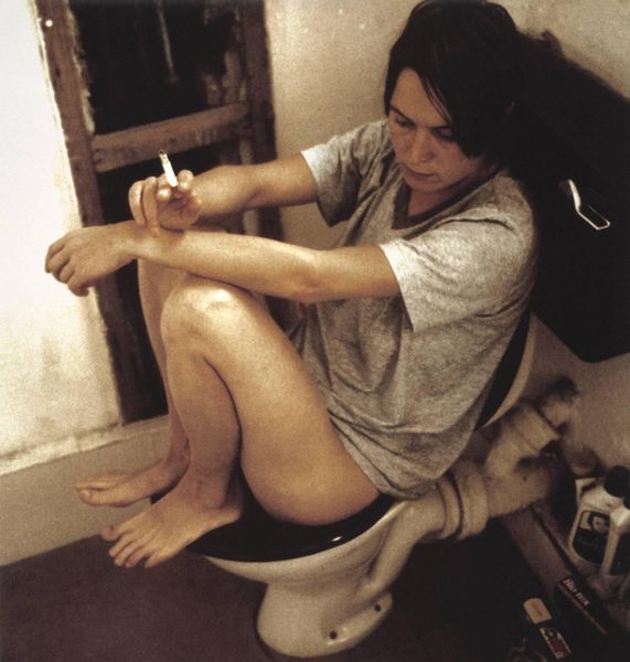 Lucas's group of twelve photographic self portraits have been reproduced digitally as Iris prints in an edition of one hundred and fifty. They range from her first photographic self portrait, Eating a Banana 1990 (P78443) to the more recent Human Toilet Revisited 1998, which also exists in the Tate collection as a c-type print (Tate P78299). Photographic self portraits have been an important element of Lucas's work since the early 1990s. The seminal Eating a Banana changed Lucas's perception of her 'masculine' appearance from being a disadvantage to being something she could use in her art. 'I suddenly could see the strength of the masculinity about it - the usefulness of it to the subject struck me at that point, and since then I've used that' (Lucas quoted in Barber, p.16). The resulting confrontational self portrait photographs, made throughout the 1990s, complement her sculptural and installation work. Through them she presents an identity which challenges stereotypical representations of gender and sexuality. Posing simultaneously as tough and abject, macho but female, she creates an image of defiant femininity. Two of Lucas's early collages which post-date Eating a Banana, Divine 1991 (P78444) and Self Portrait with Mug of Tea 1993 (P78445), have been included in the group. In these two images, as in the later Self Portrait with Fried Eggs 1996 (P78447), Lucas appears in the macho pose she has claimed as her own. Clad in old jeans and heavy footwear, she sits with her legs wide apart and her feet planted firmly on the ground. Androgynous t-shirts and leather jackets feature in many of the images. In Self Portrait with Knickers 1994 (P78446) she stands, hands on her hips, her dark-coloured 'hard-chick' clothing contrasting with the white underwear strung up on a washing line behind her. In all these images her gaze back at the viewer is direct and uncompromising. Food representing or standing in for sexual body parts is a common theme in Lucas's work, mainly employed to reveal and subvert degrading objectification of the body in vernacular language. Fried eggs feature as breasts in sculptural installations and cover Lucas's own breasts in her Self Portrait with Fried Eggs. In Got a Salmon On #3 1997 (P78451) Lucas stands outside a public toilet, a huge salmon resting from her shoulder to below her waist, a pun on the idea of a female erection. Summer 1998 (P78452) portrays Lucas grimacing as she is sprayed with frothing beer. Like Eating a Banana and Lucas's film, Sausage Film 1990 (Tate T07313), it satirises traditional female roles in pornography. These images present a female artist of masculine appearance as an object for male desire. Cigarettes have featured regularly in Lucas's work, as a rebel accessory, a phallic stand-in and a means for independence, for 'possessing time in a palpable way, stopping to pause and contemplate … It's really important to have areas of your life - whether it's walking into a pub or smoking - where you suddenly feel you've found your own time zone.' (Lucas quoted in Sarah Kent, 'Young at Art', Time Out, October 7-14 1998, pp.38-42, p.42.) Fighting Fire with Fire 1996 (P78449) is a moody close-up depicting Lucas frowning with a fag between her lips. Smoking 1998 (P78453) is a more meditative image of the artist exhaling smoke as she lies, looking into the distance. The mood of Smoking is similar to that of the earlier image Human Toilet II 1996 (P78448) in which Lucas sits naked on the toilet bowl holding its cistern on her lap. As in Human Toilet Revisited 1996 (P78454) she has been photographed looking away from the camera and presents a more vulnerable aspect than in the confrontational poses of the earlier images. She appears caught unguarded in moments of quiet contemplation, perhaps closer to a meditation on the death drive which prevents people from giving up smoking despite its destructive effects on the body. Lucas is fascinated by the paradoxically co-existing drives towards both sex and death described by Sigmund Freud in his essay Beyond the Pleasure Principle (1920). She refers to this in Self Portrait with Skull 1997 (P78450), a photograph in which she sits on the floor with her legs apart and a skull positioned between her feet. Equating her sex with death, this image encapsulates the fear of obliteration, through a projected fantasy of engulfing and swallowing, evoked traditionally by the female body. For Lucas, as the female subject, this threat is posed by her own urges towards pleasure and self-destruction. Further reading:Pippa Coles, Matthew Higgs, Jacqui Poncelet, British Art Show 5, exhibition catalogue, South Bank Centre, London 2000, reproduced (colour) pp.88-9Lynn Barber, 'Drag Queen', Observer Magazine, London, 30 January 2000, pp.10-16Sarah Lucas, exhibition catalogue, Museum Boymans-van Beuningen, Rotterdam 1996 Elizabeth ManchesterDecember 2001