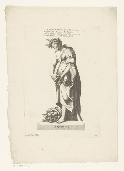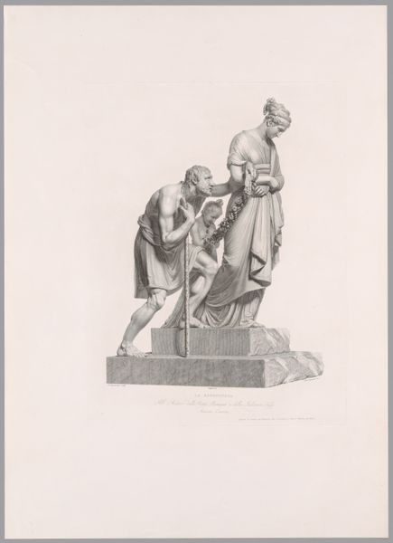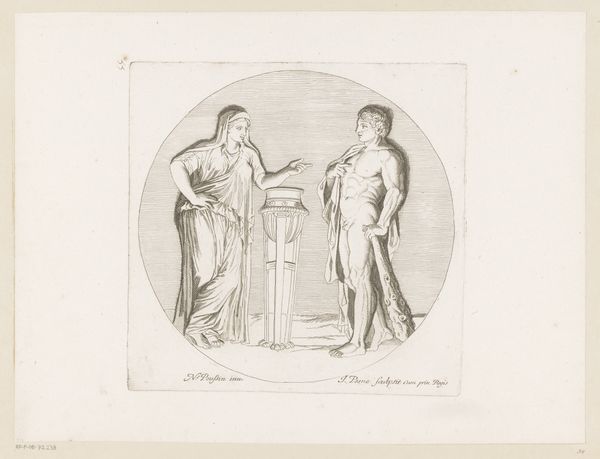 Julien-Léopold Boilly created this print titled "Thalia en Melpomene." This piece invites us to consider the representation of women within the arts and the broader societal expectations placed upon them. Thalia, the muse of comedy, is depicted in a relaxed pose, leaning casually on a pedestal, while Melpomene, the muse of tragedy, stands tall and holds a staff. This contrast embodies the different emotional registers associated with femininity. In a time when women artists faced significant barriers, these depictions also reflect the limited roles often assigned to women in the arts: either as lighthearted entertainers or figures of sorrow. The artwork’s composition further emphasizes this divide, positioning the muses as distinct and almost oppositional figures. What do you think of when considering how women continue to navigate these expectations and challenge traditional narratives?