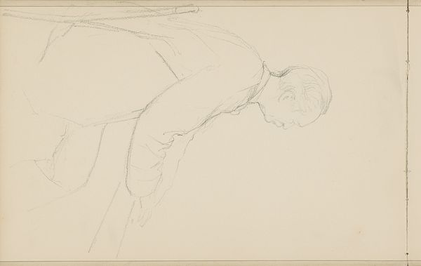 Curator: Before us, we have a pencil drawing by Victor Müller entitled "Die Richard III. heimsuchende Prinzessin Anne, als männlicher (_) Akt," currently held at the Städel Museum. Editor: It’s striking. Stark, even. The pose seems vulnerable, and yet the androgynous, almost careless rendering exudes a subdued power. Curator: Exactly. Focusing on the material, it’s evident that Müller utilizes the pencil with deliberate simplicity. Look at the economy of line, how he captures form and gesture with such minimal effort. The laid paper adds to this feeling. We see no furious artistry at work here, nothing precious. This suggests a process more about working through form and anatomy and less about finished presentation. Editor: But this apparent simplicity belies its complexity. To cast Anne, the grieving widow of Richard's victim, as a nude male figure is to destabilize traditional representations of power and mourning. It begs the question of masculine authority over historical narrative. Think about the male gaze often applied to portrayals of women and how that’s complicated here. Curator: And consider the paper itself – its ready availability signifies art for exploration and instruction rather than something monumental. Perhaps a study done to develop another idea. Was there an ease of material and its implications? Its accessibility might denote something about artistic communities and instruction that other forms of media and support wouldn't reveal? Editor: Precisely. This speaks volumes about how identity and historical trauma were being re-evaluated. And isn’t it a challenge to those historical and literary interpretations that frame women solely through their relationship to male power? It provokes discussion around the constructed nature of gender itself. Curator: Agreed. This drawing compels us to consider how something as seemingly simple as pencil on paper can be charged with artistic, material, and sociopolitical questions. It prompts inquiry into artistic development within shifting production contexts and how artworks and sketches are used, exchanged, valued. Editor: Ultimately, this artwork becomes a powerful statement about the complexities of gender, power, and the way historical narratives can be manipulated and reclaimed.