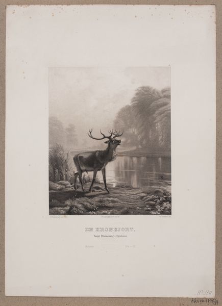 Curator: We're standing before Frederik Hendrik Weissenbruch's "Hert in landschap," which translates to "Deer in Landscape." The print, rendered in graphite, dates somewhere between 1838 and 1863. It's quite a serene tableau, wouldn't you agree? Editor: Serene is one word for it; "brooding" also comes to mind. The somber palette, the solitary stag… it has a distinctly melancholic air. I almost hear the echo of its lonely call in the silence of this landscape. Curator: The stag, as a symbol, frequently embodies solitude and nobility, and certainly aligns with prevalent themes in Romanticism and early Realism, the movements Weissenbruch worked within. Considering its gaze and imposing antlers, would you say that this is the defining symbol of masculinity in nature? Editor: Masculinity, absolutely, but not in a showy, performative way. It feels more like quiet strength and resilience. There’s a stillness in its gaze. You know, I feel more connected to a wild untamed, vulnerable essence through his depiction than of any traditional portrayal of masculine confidence and poise. Curator: It’s remarkable how Weissenbruch uses simple graphite to evoke such complex feelings. Observe the textural contrast—the soft foliage against the smooth water, the detailed fur of the stag compared to the blurred distant mountains. It is truly the only colour, though—how does that impact you, emotionally? Editor: The limited palette emphasizes the contrast between light and shadow, enhancing the emotional intensity of the piece. I wonder if that’s also why the work elicits some of that melancholy that I sensed at first—the darkness versus the light… Is there something we’re missing in our emotional response, like hope in this wilderness? Curator: I agree, though his choices weren’t merely emotional. Remember, 19th-century realism strived for objective representation, a visual inventory of the world, uncolored by sentiment. It seems as if the aim wasn’t an expression of feelings but the rendering of the seen object with painstaking honesty, which makes the fact that this artwork provokes our discussion even more intriguing. Editor: "Painstaking honesty"... Yes! Perhaps it is Weissenbruch’s honesty in conveying the deer's quiet strength, and the vastness and indifferent reality of nature that make the image so gripping. It avoids easy sentimentality by remaining faithful to the harsh elegance of its subject. Curator: Perhaps both our perspectives aren't as dissimilar after all. Seeing an echo of the real reflected so starkly back in graphite. Editor: Or perhaps feeling seen. It's like glimpsing your own reflection, vulnerable but strong, in the depths of that solitary stag.