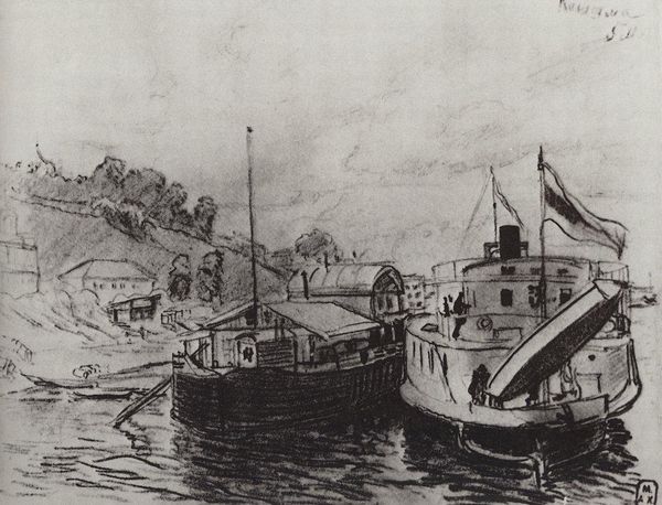 Curator: This drawing, titled "The Jersey Shore from Riverside Drive," is by Muirhead Bone. Look closely at the details rendered simply with pencil and pen. Editor: Immediately, I’m struck by the sketch-like quality and the somber mood. It feels unfinished, or maybe that’s just the effect of the industrial subject matter softening into a tonal landscape. Curator: It does feel intimate, almost like glimpsing a page from the artist’s personal sketchbook. The industrial elements—smokestacks and cranes—become almost quaint when observed with such a sensitive eye. Think of the history imbued in images of harbors—departure, arrival, and all the labor associated with that. Editor: Exactly. The boats feel packed, maybe overcrowded? I keep coming back to how that feels connected to turn-of-the-century immigration patterns. It’s subtle, but these visual choices carry weight. Were the conditions ideal for those dock workers? What’s often left out of "landscape" imagery, specifically as it concerns those who dwell and occupy its social peripheries? Curator: Bone's use of line is so fascinating, isn't it? How the pen work describes form with an economy of means. Look at the foreground textures against the misty background. Consider the symbol of water itself as transition or transportation... It's about capturing not just the appearance but the underlying energy. Editor: Absolutely. Even the very choice of medium – the pencil sketch - feels loaded, suggesting an immediacy and rawness that oil painting of that time period just didn’t attempt to achieve, and certainly not when dealing with this type of social-realist imagery. Bone could be pushing back against those accepted art forms of the time and asking his own set of nuanced questions. Curator: Thinking about what it meant to create urban landscapes in sketchbooks, we circle back to something like a private journal – documenting change, progress, and a bit of melancholy. Editor: Melancholy, yes. But also potentially speaking to our own role in this very real place and moment. This invites introspection, to consider not just what *is*, but to dream, in whatever way we can, what *could be*.