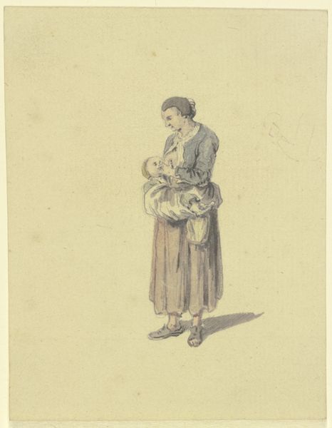 Editor: So, this is "Lettuce Seller," an etching by Anne Claude Philippe Caylus, from 1742. The realism is striking! What I find most compelling is the figure's gaze. It feels so direct. How do you interpret this work? Curator: Indeed. The gaze connects us to something enduring. Consider how Caylus has captured not just the physical appearance, but also the weariness, resilience, and perhaps even the dignity of this woman. The lettuce, an ancient symbol of fertility and regeneration, is being sold. She's part of the infrastructure, the lifeblood of the city, rendered in an unforgivingly realistic light. What symbols or societal roles might this image challenge or reinforce in its time, do you think? Editor: That's fascinating! I hadn't thought about the symbolism of the lettuce itself, more about the realism. Maybe it was intended to ennoble the working class, making them more visible? Or was it simply a neutral study? Curator: I believe it does both, and perhaps subtly unsettles our assumptions about value, about who and what we deem worthy of representation. It reflects an evolving awareness, yet it simultaneously perpetuates the class structure by objectifying labor, but allowing dignity through the seller's direct engagement. What is more valuable, the lettuce or the person who sells it? Does the image invite compassion, critique, or something in between? Editor: That’s such a thoughtful approach. It’s much more than just a portrait or a genre scene, but something much deeper and timeless. Curator: Precisely! Through careful observation and consideration of symbols, we gain access to multiple layers of understanding, reflecting our cultural values.