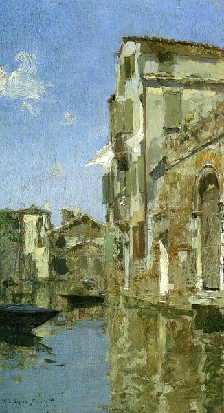 Curator: This artwork, rendered with oil on canvas, is entitled "Vue De Venise," attributed to Maurice Bompard. The painting style indicates characteristics of impressionism. What are your first thoughts about this cityscape? Editor: Immediately, the mood is strikingly calm. The brushstrokes give a fluid feel to the water, and even the architecture seems to be breathing. There’s a gentle interplay between light and shadow here that I find captivating. Curator: Venice, a city celebrated for its waterways, becomes a focal point in art history and, arguably, a contested space politically, socially, and even environmentally, especially today with discussions around tourism and rising water levels. Bompard captures a particular view, almost sanitized of any complex realities. How do we view such romanticized imagery today? Editor: I agree; there's a level of idealization present. Consider the figures in the gondola—are they presented as workers or merely part of the picturesque view? And who is this “vue” really for? Is it meant to reinforce a certain image of Venice for an outside audience, a colonial gaze perhaps, at the expense of the lived realities of its inhabitants? Curator: Exactly, the role of the artist becomes critical here. By framing Venice in this way, Bompard potentially participates in creating and perpetuating narratives that favor certain classes. We see the beauty, sure, but whose stories are left untold? What power dynamics are reflected in that artistic decision? Editor: And this is also an example of impressionism—focusing on sensation, light, atmosphere – over say, any sort of explicit social commentary. Are we simply meant to appreciate the artist's technical skill, or do we demand that art engage with more difficult themes? Curator: It’s a call to actively decode and challenge dominant ideologies reflected in art. Asking who benefits, who is excluded—it enhances, not diminishes, the experience. Editor: I leave looking at it now with a little more than a simple aesthetic appreciation, aware of the conversations and questions it brings forward. Curator: Indeed, art, even when seemingly benign, often whispers louder than it seems, revealing threads of the social and political fabric within which it was created.