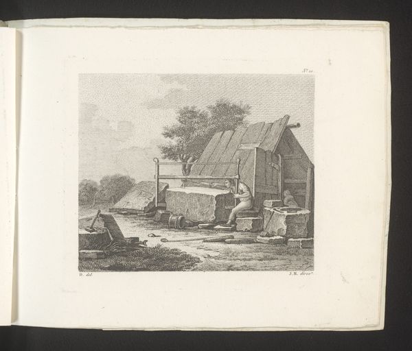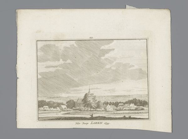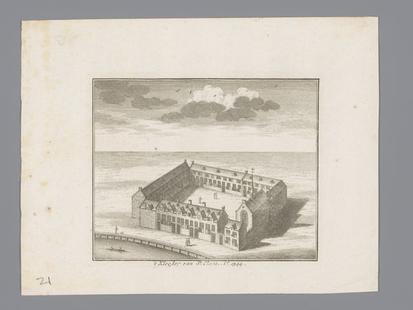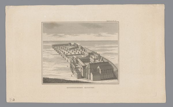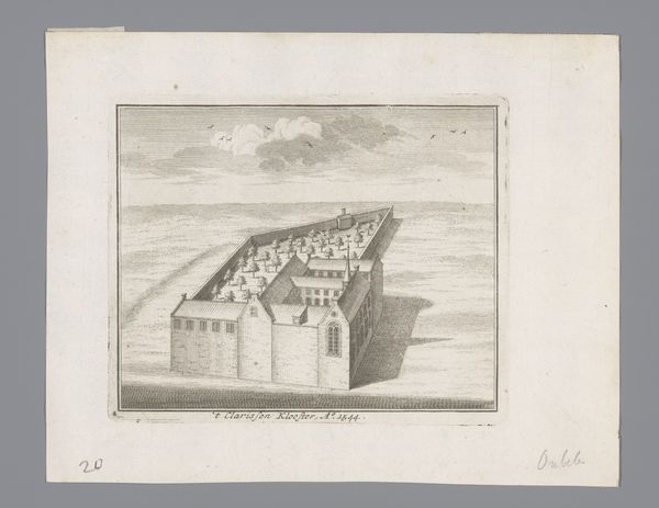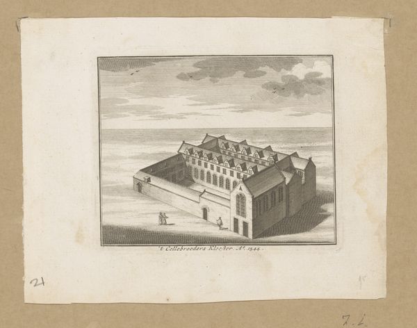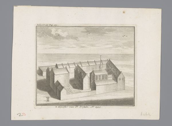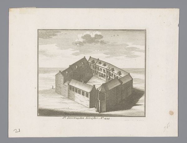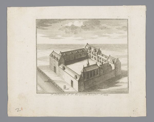 Editor: Here we have "View of the St. Peter's Hospice, 1544", but this engraving comes from 1729 and is by Johannes van Septeren. It has such a sparse and remote feel to it. How would you interpret this work? Curator: Well, let’s think about what's physically here: an engraver in 1729 depicting a building from 1544. The layering of production is key. What materials were used? The paper itself, the ink, the metal plate for the engraving - each tells a story about labor and trade in the 18th century. It's not just about representing the hospice. It is also about the labour of printmaking in the 1700's. Editor: So, less about the historical depiction, more about the process that got us here? Curator: Precisely. Consider how the lines are etched, and how they give shape to our understanding of craft, which in this instance serves to depict this building. It’s a commodity made for consumption. How does this reframe our reading of the historical event it's supposedly documenting? What’s being consumed here: art or information? Editor: Interesting…so even this seemingly simple landscape offers insight into a far broader network of materials and their role in society. I’ll definitely think about art-making and the role of materials in everything now. Curator: Glad I could assist in showing this relationship. Keep that in mind, and it can shape how you view every piece!