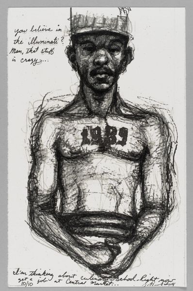 Curator: Here we have Sedrick Huckaby’s “99% NO.18 Brion,” currently held at the Harvard Art Museums. It’s a small work, executed with graphite and ink on paper. Editor: The frantic, raw lines create a mood of undeniable tension. You can sense the weight of whatever conversation he’s having. Curator: Absolutely. Huckaby often explores Black identity and experience, and this piece seems to capture a very personal moment, mediated by technology. Note the scrawled text at the bottom. Editor: Yes! "I don't know about you but..." and then, on the other side, "Man, I can't stay like this..." The artist inscribes his emotional state directly into the image. Curator: It’s a powerful reminder of the burdens individuals carry, often unseen by the broader social structures around them. Editor: Indeed, a poignant glimpse into a private struggle made public through art.