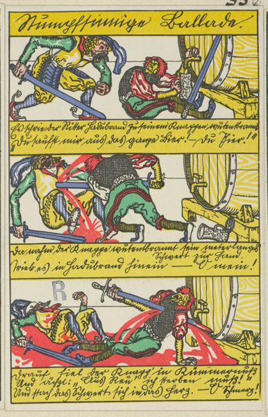Curator: Welcome. We are looking at "Ballad of the Involuntary and Voluntary Fall" by Moriz Jung, a print and pen drawing on paper completed in 1911. It’s part of the Metropolitan Museum of Art's collection. Editor: It's quite striking! At first glance, it feels chaotic, like a series of mishaps unfolding in vivid color. There's an almost comic strip-like quality, but with a distinct undertone of anxiety. The rendering is somewhat naive. Curator: Jung was very interested in pushing boundaries between craft and high art, using common material and printing to reach a broader audience. Editor: Absolutely. The social context of pre-World War I Europe is vital here. Notice how the imagery—the falling figures, the chaotic interiors—mirrors the societal anxieties of the time. The use of a “ballad” as a form situates it within a tradition of storytelling that often conveys political or social commentary. Curator: I think this work provides visual storytelling through materials that echo working-class readership. The artist utilizes cheap papers and rudimentary processes. Editor: And the subject matter! A man falling from a plane is greeted by death figures? And there’s another scene where an embrace happens after he falls from what appears to be a closet. He is celebrated with a sign of what seems like impending doom, which speaks to a broader cultural fascination with progress and its potential dangers, but with a very funny, yet unnerving undertone. Curator: Looking closer, it does become clear that, while whimsical, the process is rooted in the expressionist moment. It utilizes readily available materials that democratize this artistic endeavor. Editor: Indeed. The bold lines, the simplified forms—all of this pushes against traditional academic styles and embodies a modern sentiment in the early 20th century of fragmentation and uncertainty. Curator: I appreciate how examining the materiality alongside its social and historical narrative informs a richer dialogue around art's place in everyday discourse. Editor: For me, seeing art as a reflection of the cultural moment underscores how it shapes—and is shaped by— prevailing attitudes towards change, progress, and relationships of love and death.