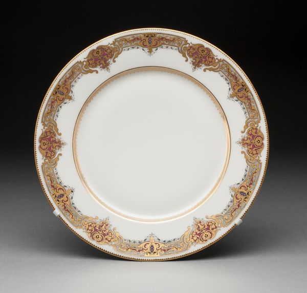 Editor: Here we have a porcelain dish from around 1730-1740, created by Claudius Innocentius Du Paquier. It's decorated with Chinese scenes, flowers, and gold ornamental borders. It’s incredibly ornate; the dish seems almost overcrowded. What strikes you most about it? Curator: The most striking aspect is precisely what you identified: its ornamentation. But let's consider the historical context. This dish exemplifies a European fascination with the "Orient," reflecting colonial power dynamics and the appropriation of cultural aesthetics. What seems merely decorative becomes, under closer scrutiny, an assertion of dominance. How do you interpret the depiction of “Chinese scenes?" Editor: I see little vignettes of figures in what I assume are domestic settings. The figures are exoticized in a way, fitting neatly into the borders. They lack individual characteristics. Curator: Exactly. The "Chinese scenes" are not authentic representations but European fantasies constructed from limited and often distorted information. This dish participated in shaping a specific image of the East that justified colonial exploitation and exoticism. Does the Rococo style contribute to this exoticism in your opinion? Editor: It does. The swirling patterns and gilded elements add to the fantasy. The porcelain itself feels like a precious commodity, emphasizing wealth and power. Curator: Precisely! The dish, therefore, becomes an artifact of cultural exchange *and* appropriation. The flowers, though seemingly benign, were also strategically deployed in the decorative arts, reflecting control over resources and trade routes. Consider its display; imagine the context in which it would have been presented. Editor: That makes the dish seem like more than just a beautiful object. It’s almost propaganda, promoting a certain worldview. Curator: I agree. So, looking at it now, it becomes something to question, rather than passively admire, right? Editor: Definitely! I’ll never look at a porcelain dish the same way again. It’s fascinating how historical context transforms our perception.