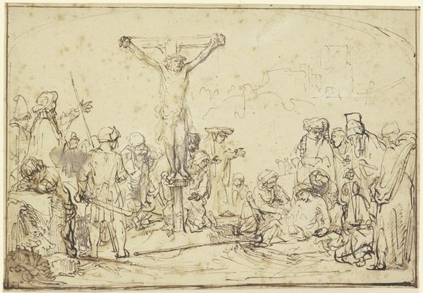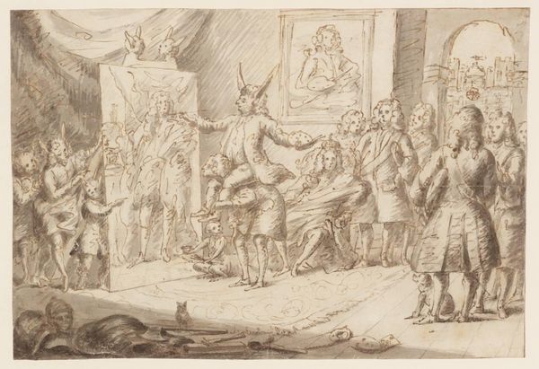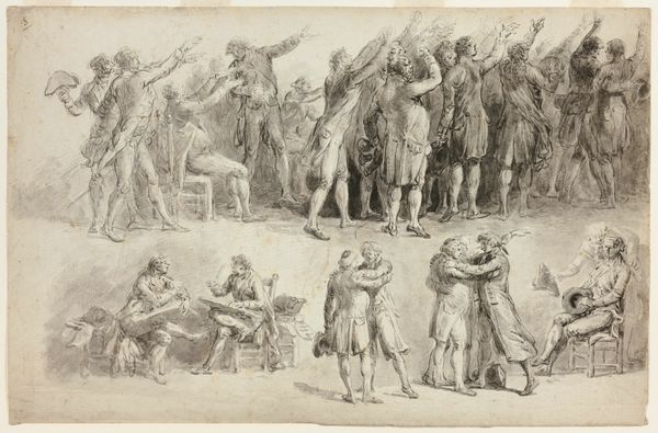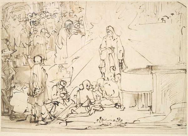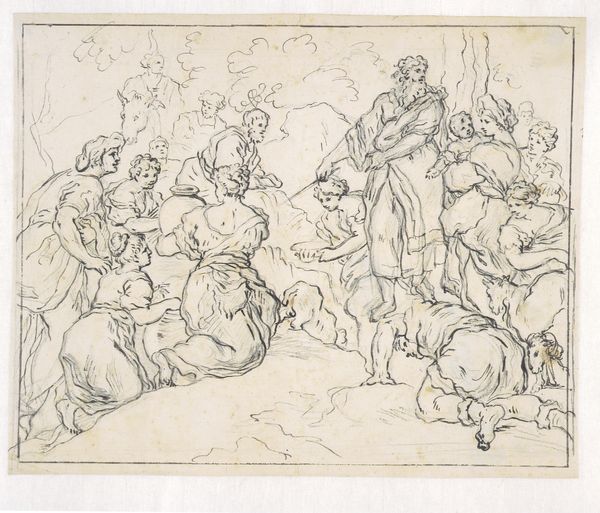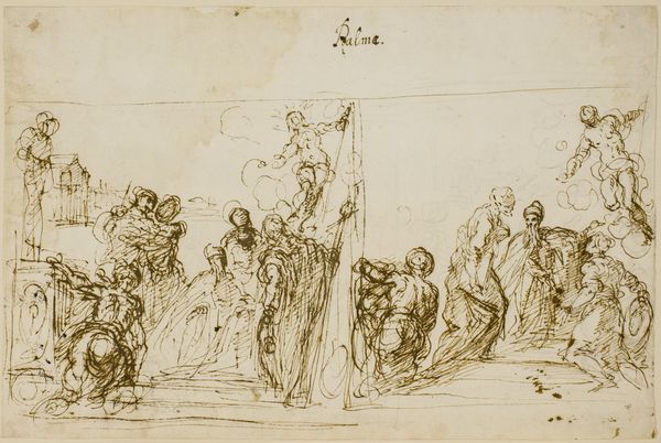 Editor: This is "A Crowd of Persons in Antique Roman or Oriental Dress, Gathering at a Pagan Altar," a pen and ink drawing created around 1743 by Giovanni Domenico Tiepolo. There's a definite energy in the gathering. The figures, though sketched, convey such a sense of bustling anticipation. What compositional choices stand out to you? Curator: The rhythmic articulation of line is key to appreciating Tiepolo's formal command. Observe the density of the hatching to create shadow and volume, lending a sculptural weight to figures despite the lightness of the medium. What does the configuration of figures around the altar suggest to you? Editor: It seems the altar serves as a focal point, with the figures clustered, yet arranged in layers. Their postures contribute to an understanding of the depth, pushing them slightly to the back. Could we also read the altar and the objects near it, as the visual anchors of this sketch? Curator: Indeed. Consider the intentionality in the contrasts: the angular folds of fabric versus the curves of the ceremonial urn. Tiepolo's control manifests in the calligraphic nature of each stroke, directing our attention and creating points of emphasis throughout the work. Where does your eye find its rest within the composition? Editor: Perhaps where the lines are sparse, like in the lighter washes or blank spaces. The white becomes as important as the lines to define the shapes and separate each person in the composition. Seeing the sum of those minute variations really helps me understand the complexity of Tiepolo's vision. Curator: Precisely. It’s through such visual decoding that we grasp the sophistication of his practice and thought; the strategic balance he creates.
