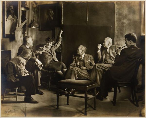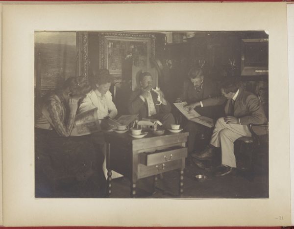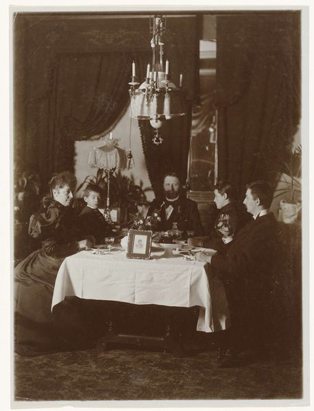 Curator: This gelatin-silver print, taken sometime between 1895 and 1905, captures a family at leisure. It's credited to Henri Osieck and is titled "Familie aan tafel en aan de piano, thee of koffie drinkend en lezend in De Kampioen." Quite a mouthful! Editor: It feels incredibly staged, doesn’t it? There's a warmth, but it is overshadowed by the subjects being aware they're being observed. The tones of the image lend it an austere, nostalgic air, almost as if it is deliberately aged and tinted in sepia tones. Curator: Yes, while staged, it’s a fascinating study in compositional arrangement. Note how the artist uses the table and piano to create distinct zones within the frame. The patterned tablecloth provides texture, offsetting the darker, solid tones of the clothing. Editor: Exactly. And the light! It's strategically deployed, almost theatrical. The lamps overhead illuminate the center of the table, but there is shadow play occurring around the edges, isn't there? It highlights the faces, particularly the gentleman reading. I see what they were doing, drinking, and playing... all in an opulent sort of way. A slice of the 19th-century elite. Curator: One could read the setting through a semiotic lens. The objects, the newspaper, the piano, each act as signs referring to bourgeois values of domesticity, education, and artistic cultivation. The materiality of the print, the very substance it’s made of, reminds us of its historical context and cultural value as a family photograph. Editor: Perhaps that's its success – if you call it that. These aren’t candid, revealing moments. These feel studied and curated… much like museum installations. I am half-expecting them to break the fourth wall, though! Curator: An intriguing insight. It highlights the tension inherent in much portraiture – the balance between capturing a likeness and constructing an image. Editor: Ultimately, it provokes thoughts of how we want to be remembered. Or how our descendants will regard us. In the end, I find a slightly hollow note, or sense, to this artwork, though it’s beautiful in so many senses, and one appreciates it from this remove. Curator: Yes, a staged artifact revealing so much about cultural posing.