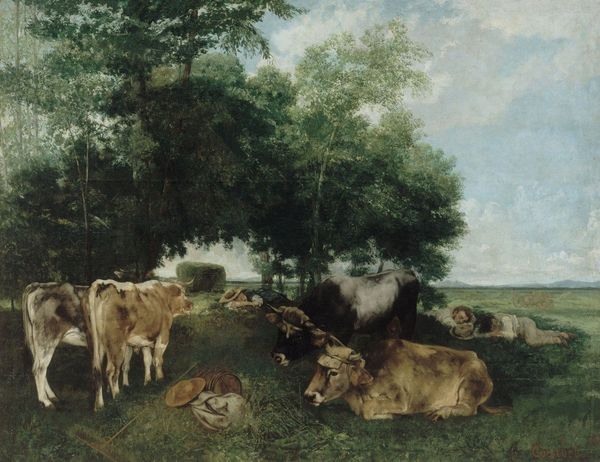 Curator: Immediately, I'm struck by how subdued it is. The sky is vast but heavy, the colors muted, the whole scene bathed in a sort of wistful tranquility. Editor: Indeed, Rosa Bonheur painted this pastoral scene, entitled "Shepherdess and Two Cows in a Meadow," around 1842 to 1845. The artwork makes skillful use of oil paint. It feels very deliberate, doesn't it? The weight of the materials reflecting the reality of agricultural labor. Curator: Absolutely. Bonheur elevates this mundane scene into something almost allegorical. The shepherdess, so self-contained with her spindle, embodies the quiet strength and industry of rural womanhood. It feels deliberately timeless, harking back to classical ideals of bucolic life. She has roots, a sense of deep belonging. Editor: Note the labor involved. Bonheur clearly understood the physicality of tending livestock, of managing the land, she gives dignity to their lives by demonstrating those material processes. The animals themselves aren't sentimentalized. They're rendered with a strong sense of realism, showing her commitment to directly recording how cattle looked. Curator: The cowherd in the distant background really reinforces that connection, and shows she knew her role. Speaking of realism, there's almost a folk-tale quality to the colors and to how all living things interact in this composition. It evokes not just an image, but also the broader narratives, traditions, and beliefs associated with rural life. What looks idyllic isn’t just beauty; it holds a record of cultural value and how work becomes meaning. Editor: Precisely. The labor is the point. Bonheur's technique demonstrates how closely linked production, skill, and value really are. The layering of paint, the carefully observed details… it’s all labor rendered materially, just like the shepherdess working in the field. Curator: This feels like Bonheur asks the viewer to connect deeply to how people construct meaning within nature itself, both personally and through community labor and belief systems. This resonates deeply still, given our ongoing connections to—and disconnects from— the landscapes that still nourish us. Editor: It's quite compelling when you consider art history this way: what are the means of the artwork's production? It makes you think about our present forms of creative work, as well. Curator: It certainly provides much food for thought. Editor: Indeed it does.
