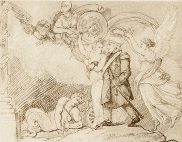 Agostino Carracci created this drawing, "Maria übergibt dem Apostel Thomas ihren Gürtel," using pen and brown ink with brown wash. The oval composition features dynamic movement, from the figures on the left ascending on a cloud, to the kneeling Saint Thomas on the right. The artist plays with light and shadow through the brown wash. See how the deliberate application of darker tones defines the drapery of Mary and Thomas, creating a sense of volume, while the lighter washes suggest a divine glow. The drawing seems to capture a moment of spiritual and physical exchange, underscored by the contrast in textures: from the ethereal cloud to the solid architectural backdrop. Note the fluid lines that define the figures, giving them a sense of immediacy. The diagonal orientation directs your eye from the heavens to earth. In essence, the artwork captures a divine transaction through careful consideration of form and composition.
