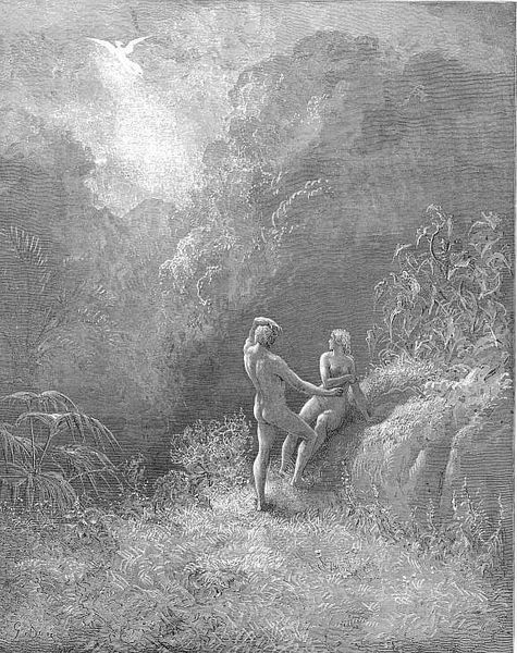 Editor: So this is “The savoury pulp they chew, and in the rind, Still as they thirsted, scoop the brimming” and it's attributed to Gustave Dore. I believe it's an etching or engraving, it definitely has that printmaking feel. The stark black and white contrast is so striking and theatrical! I’m immediately drawn to how the artist has depicted light and shadow. What compositional choices stand out to you? Art Historian: Indeed, a meticulous study reveals much. Note how the contrasting tones, meticulously rendered, don’t simply depict light, but structure the narrative. Observe the visual weight: the density of the foliage at the top versus the relative openness around the figures. Consider this binary; how might it speak to thematic concerns? Editor: Hmmm, thematic concerns...do you mean the story being told? The figures? They're quite classical, aren't they, almost idealized in their forms? Art Historian: Precisely. Reflect on the formal implications of that idealization in conjunction with the Romantic landscape. Is there a tension created by placing such idealized forms within an almost chaotic natural setting? How does that relationship shape our understanding? Editor: I see what you mean. The figures almost seem placed “on” the landscape, not part of it. That separation highlights the disruption or intrusion they represent within that space, right? Thanks, I'm definitely going to think more about that relationship between figure and ground and its symbolism in other artworks, too. Art Historian: An excellent exercise. Understanding the structural relationships within a work – the play of form against form – is key to unlocking deeper layers of meaning.