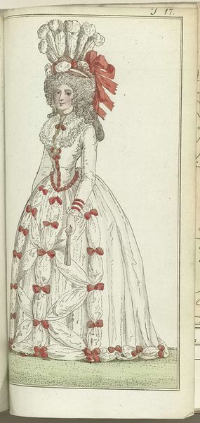 Editor: This is "Journal des Luxus und der Moden 1788, Band III, T.7," created in 1788 by Friedrich Justin Bertuch. It looks like a print on paper, using engraving, pen, and coloured pencil. The towering hat immediately strikes me. How do you interpret this work? Curator: Beyond the aesthetic, consider the historical context. Fashion plates like this were tools. They weren’t merely reflecting trends, but actively constructing them. How might this image participate in shaping and controlling gender roles and class distinctions? Editor: So, it’s less about documentation and more about prescription? The woman's pose, the almost aggressive angle of her pointed finger… it does feel performative. Curator: Exactly! Think about the "Journal" itself – a luxury publication aimed at a specific demographic. What does this tell us about access, consumption, and the visual language used to maintain social hierarchies? How does this contribute or challenge notions of female agency at the time? Editor: It's interesting to consider it not just as a pretty picture, but as a commentary on power. Is it subtly enforcing certain expectations of women? Curator: Precisely. By visually codifying ideals, it participates in a broader discourse on acceptable identities. And let’s consider the Romanticism tag, too. What aspects of Romanticism do you see at play? Is it critiquing society by idealizing a certain femininity, or is it reinforcing stereotypes? Editor: This makes me think about how even seemingly innocent images can carry so much cultural weight. It's more than just a fashion plate; it’s a social document. Curator: Absolutely. This is where art history becomes a tool for understanding the complexities of the past and the continued relevance of these issues in the present. Editor: I will definitely look at similar fashion plates with fresh eyes now, recognizing how they actively shaped the world they depicted.