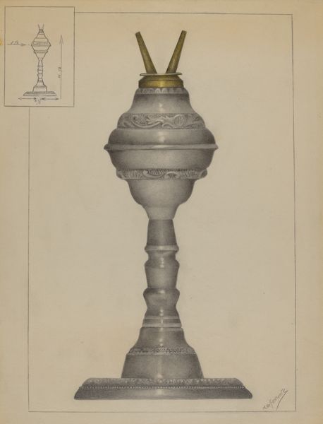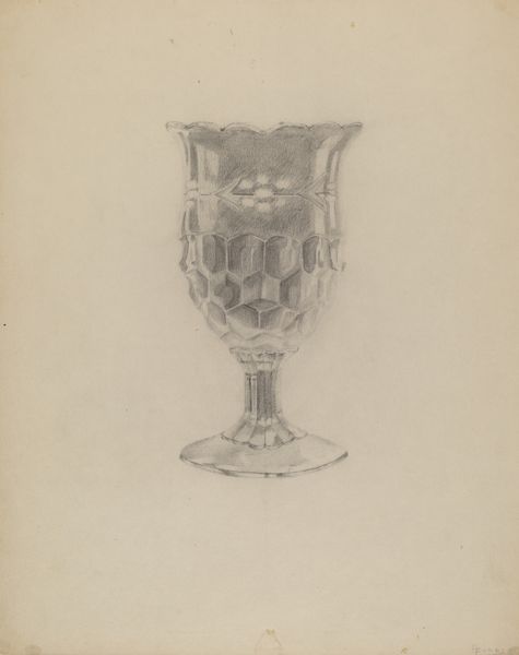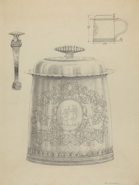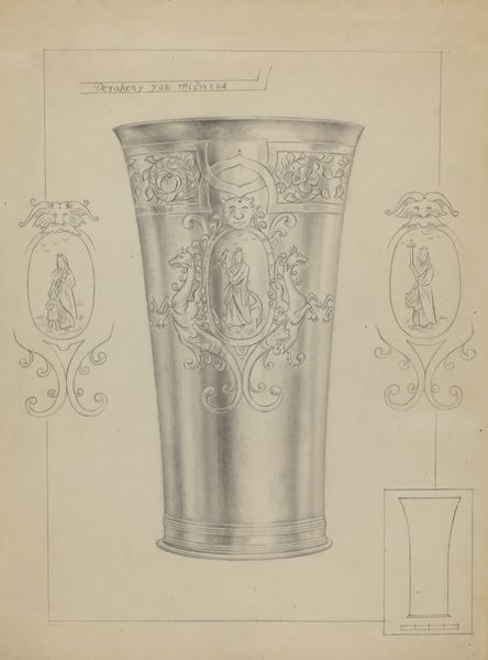 Curator: This delicate pencil drawing is titled "Silver Beaker," created around 1936 by Richard Schoene. Editor: It’s interesting how such a simple drawing evokes such an idealized vision of grace, isn’t it? I’m drawn to the detailed renderings of floral motifs, and these, ah, these sort of miniature scenes arranged around it. The composition overall speaks to me of a longing for a bygone era, of order. Curator: Indeed. Schoene's choice of figuration and the precision of the line work recall academic traditions, yet the subject matter hints at a broader engagement with cultural symbols. Beakers, historically, haven’t just been about function, right? Editor: Certainly not. It seems that we cannot only appreciate the piece’s artistic merit but also consider the intended cultural context, even if this image appears without provenance details. I would add that even in the most utilitarian objects, symbols of power, privilege, even spirituality might get encoded… The female figures, floral decoration… Perhaps a reflection of contemporary expectations and restrictions placed on women’s roles in interwar society? Curator: That's a very relevant line of inquiry, one through which to consider the symbolic resonance. Those female figures, do they perhaps echo prevalent tropes regarding domesticity and virtue? Could this rendering serve as commentary, endorsement, or perhaps even subtle subversion of the day’s gender roles and its ideals, viewed in conjunction with Schoene’s specific milieu? Editor: Right, or perhaps the drawing offers an insight into the intended future readership. After all, these types of decorative items might have been reserved to special events or given to some restricted categories of citizens. Schoene uses those cultural objects for some unknown propaganda, or for some kind of social distinction for which the work operates beyond art-historical analysis. It also allows us to view art as embedded within systems of economic exchange and ideological communication. Curator: Thinking about art as intrinsically linked to social dynamics and systems, how then does that apply to Schoene's piece today? The dialogue has given us, as museum professionals, a window into the art's enduring cultural significance in the now! Editor: And, from that perspective, it pushes us to stay receptive to the cultural layers encoded into that design.