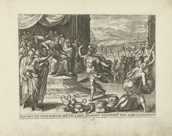 Curator: This is "Discussie tussen minderbroeders en pauselijke afgezanten," or "Discussion between Friars Minor and Papal Envoys," an engraving dating from 1721, created by Jacob Folkema, now held in the Rijksmuseum. Editor: Immediately, I'm struck by the dynamic composition, how Folkema manages to convey such intense conflict and tension with fine lines and stark contrasts. There's an almost theatrical quality to the scene. Curator: Yes, that tension is masterfully crafted through symbolic arrangements. Note the Pope elevated on his ornate throne, framed by ecclesiastical symbols, literally elevated above the turmoil below. That theatricality might stem from Baroque aesthetics, or it could be exaggerating papal authority, considering the subject. Editor: The "subject" being this intense dispute. It’s more than just religious aesthetics; there’s clearly a power struggle represented. We see the Franciscans seemingly pleading their case to the papal envoys, but the fallen figure in the foreground evokes images of defeat and potentially symbolizes a crisis of faith. Curator: Indeed, it speaks volumes about challenges to papal infallibility, or critiques of the Church’s temporal power at the time. The light draws the eye to that central figure on the throne. Editor: I agree. Even beyond that spotlight, I think it really begs the question, whose story is being told here? The image seems sympathetic to the Friars Minor. This dispute likely touches on the church's interaction with the poor or their broader commitment to the original message. Curator: It's hard to say definitively. Visual rhetoric often served multiple purposes. Perhaps it's not about siding with one faction, but more about using a well-known narrative to question broader concepts of authority and piety. The cultural memory embedded in this religious imagery would have been readily accessible. Editor: The power of religious imagery to embody the dynamics of political struggle truly resonates even now. It reminds us that art often functions as a record and, potentially, as resistance. Curator: Ultimately, this engraving reveals the subtle and persuasive language of imagery in mediating social discourse. It is through repeated symbols that cultural meaning perpetuates. Editor: And by disrupting these established meanings that progress becomes possible.