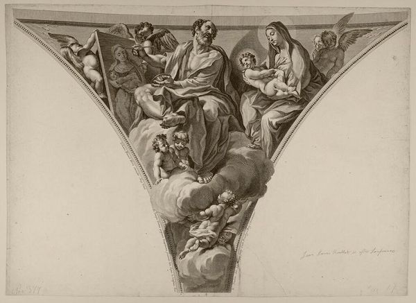 Curator: Domenico Cunego, who lived from 1726 to 1803, created this print titled "The Brazen Serpent," now part of the Harvard Art Museums collection. Editor: It feels like a coiled nightmare, all tangled bodies and a snaky, bronze glint in the middle. Curator: The artwork depicts a scene from the Book of Numbers, when God sent serpents to punish the Israelites, but offered salvation to those who looked upon the bronze serpent Moses created. Editor: So, it's about looking to the source of your pain for healing? A bit like staring your demons in the face… or maybe just getting a really good prescription? Curator: It's interesting to view this through a lens of power dynamics. The gaze towards the serpent becomes an act of submission and faith, yet also a potential reclaiming of agency. Editor: You know, the composition makes me feel a little claustrophobic, like being trapped in a really intense therapy session. Curator: Perhaps Cunego aimed to evoke that sense of collective suffering and the desperate search for redemption. Editor: I guess even in a bronze snake, there’s a glimmer of hope. Art—it always sneaks up on you, doesn’t it?