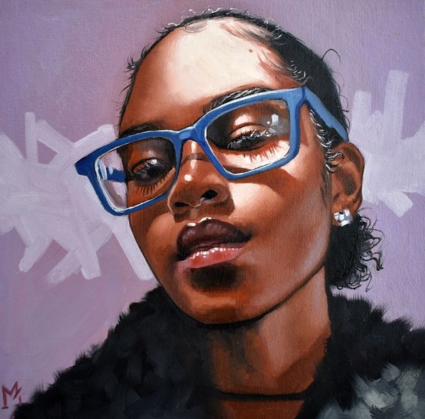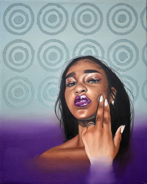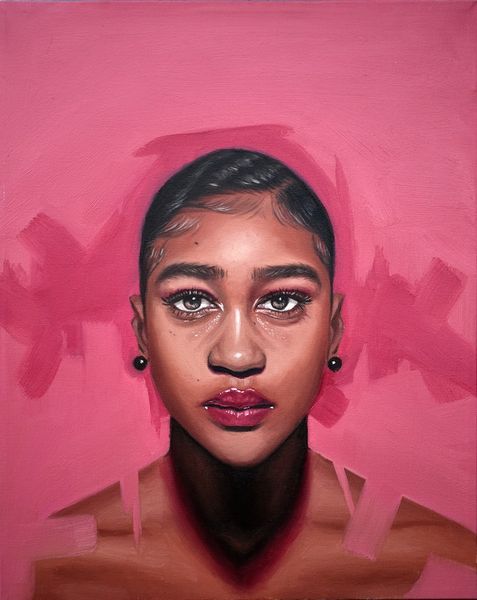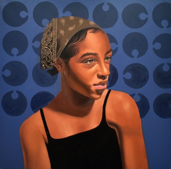 Curator: Monica Ikegwu’s striking portrait, "Bantu," painted in 2017 with oils, really captured me. What are your first thoughts looking at this piece? Editor: Well, it's immediately arresting, isn’t it? The monochrome palette is so compelling, and the subject’s downcast gaze gives off a sense of introspection, or perhaps… weariness? There’s almost a melancholic stillness about it. Curator: Weariness… that's a great read! The simplicity of the color scheme, purple on purple, allows for so much focus on her face. It feels quite intimate. I see a sense of serene dignity, even quiet power. What does it evoke for you on a deeper level, knowing that her hairstyle inspires the title? Editor: The term “Bantu knots” references a vast and diverse group of people. Situating the work within that context is key. Colonization often involves suppressing or appropriating cultural practices, and the styling of Black hair is certainly no exception. There is something subversive in this celebration of Black culture in direct opposition to Europeanized beauty standards. The hyperrealistic execution really brings that into focus. Curator: That tension, that defiance you highlight is potent. It makes you consider representation, and visibility, whose stories get told, and who gets to tell them. How much intention does she put in the gaze that the woman in the painting offers, to accept herself? The quiet beauty of it is loud! Editor: Absolutely, and that specific hairstyle – Bantu knots – holds cultural significance that goes beyond just aesthetics. We must discuss the ongoing debate regarding cultural appropriation, the hyper-sexualization of Black women's hairstyles, and even workplace discrimination in response to them. This painting creates an opportunity to reflect upon so many issues, making it politically engaged in its quietude. Curator: I love how we can linger and ruminate on how her silence can make room for a lot to be considered. And to then just reflect on this striking use of color as if the subject of the work seems bathed in both royalty and shadows, all the same, right? The impact resonates beyond the visual. Editor: Precisely! It is not just a portrait, but a powerful declaration. Thanks for walking me through it, that added many nuances that I needed. Curator: Anytime!
