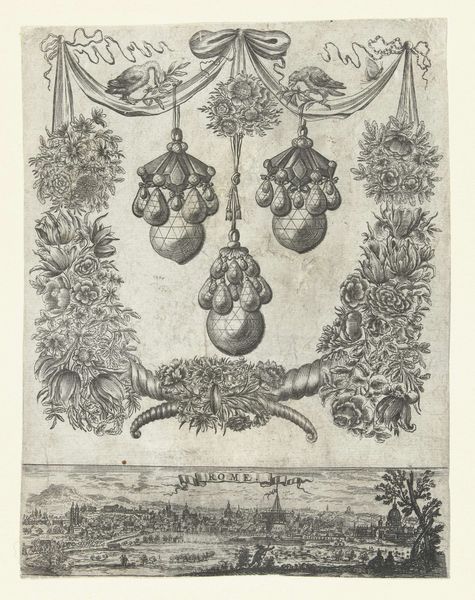Balthazar Moncornet created this print, "Cartouche met drie sieraden, onderaan de tuin van het Kasteel van Ruel," showcasing an elaborate cartouche featuring jewels, floral arrangements, and squirrels, set above a garden view. The jewels, emblems of wealth and status, dangle, drawing our eye. Squirrels, symbols of thrift and preparation, perch atop the design. These motifs remind me of similar displays of opulence in Renaissance portraiture, where jewelry denoted power and status. Consider the garland— a motif echoing classical antiquity, reborn in countless forms across centuries. What once symbolized victory and celebration in ancient Rome evolves here into a frame for aristocratic display. This transformation reflects a culture grappling with its past, reinterpreting symbols to suit new aspirations.