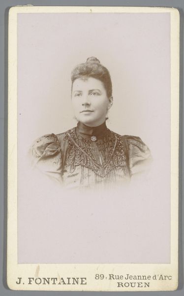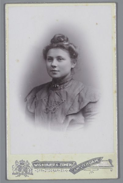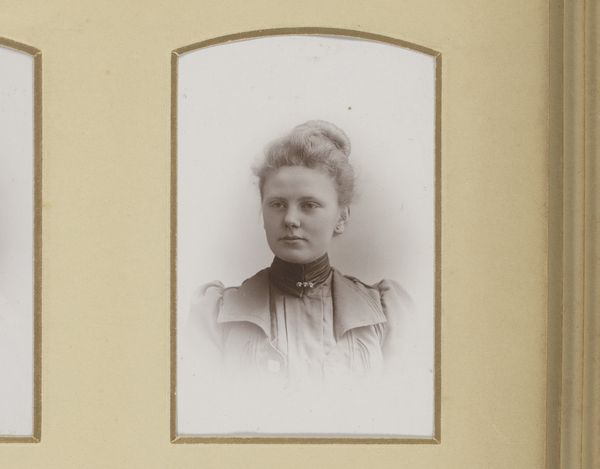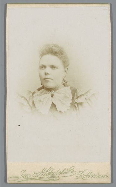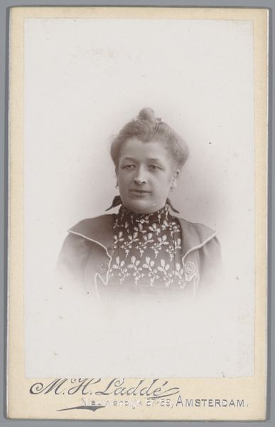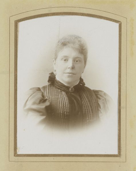 Curator: This gelatin-silver print, dating from around 1892 to 1906, is simply titled "Portrait of an Unknown Woman." It comes to us from the collection of the Rijksmuseum, created by the Amsterdam-based photographer Machiel Hendricus Laddé. What strikes you about it? Editor: There’s an immediacy, almost a solemnity to it. The subject’s direct gaze holds a certain weight. The tones are muted, giving it a ghostly effect, as though she's staring out from a fading memory. Curator: Indeed, the medium contributes greatly to that effect. The gelatin-silver process often yields this characteristic tonal range. And yet, there’s a classic portrait composition here—it echoes painting styles of earlier decades, where an individual's status was displayed in controlled, formal portraiture. The woman’s brooch, her high-necked blouse, and even her neatly arranged hair, all contribute to an air of bourgeois respectability. Editor: But within that framework, doesn’t there seem to be a defiance in her eyes? Consider the burgeoning feminist movements of the late 19th century. Could her steady gaze suggest a quiet challenge to the limited roles prescribed for women? Even her very ordinariness becomes a political statement. She seems to say, "I exist, and I matter." Curator: That is a powerful interpretation! It brings me to the importance of symbolism. Notice that central brooch, almost a focal point. It signifies status, yet, also, a closing or fastening. Is it protection, or is it constraint? Laddé doesn’t tell us, does he? Perhaps her direct and very present gaze demands to break beyond it? Editor: And I'm compelled to return to the ‘unknown’ nature of her identity. Laddé gives us this single image – a brief encounter across history, stripped of narrative beyond the sitter and the artist. The very absence of identifying details reframes the piece. She becomes Everywoman. It suggests broader reflections about identity, representation, and what photography really ‘captures.’ Curator: I concur. The mysteries held by such images resonate powerfully across generations, inviting fresh engagement with both the known and unknown, and questioning, continually, the symbolic nature of a face from the past. Editor: Yes, the absence of a definite narrative can often encourage deeper connection to universal struggles and the enduring power of visual representation.