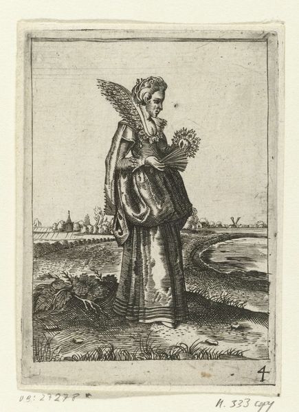 Adriaen Matham created this engraving, "Elegant Lady Opening her Fan", in the Netherlands, sometime in the 17th century. During this period, the Dutch Republic was a major center for trade and art. Matham's elegant lady, with her elaborate dress, hints at the elevated status and wealth that characterized the era’s elite. Her fashionable attire, fan, and bouquet reflect the importance of visual codes in defining social identity. However, there is an intriguing divergence from tradition, with the addition of a small pair of wings emerging from her shoulders. These wings add a layer of complexity to her image. This could be an allegory of beauty and virtue or even a representation of a mythological figure. The artist's intention remains ambiguous, inviting us to contemplate the nuances of identity and representation. Ultimately, Matham’s engraving captures both the grandeur and the subtleties of a society in transition, inviting a dialogue between the old and the new, the real and the ideal.