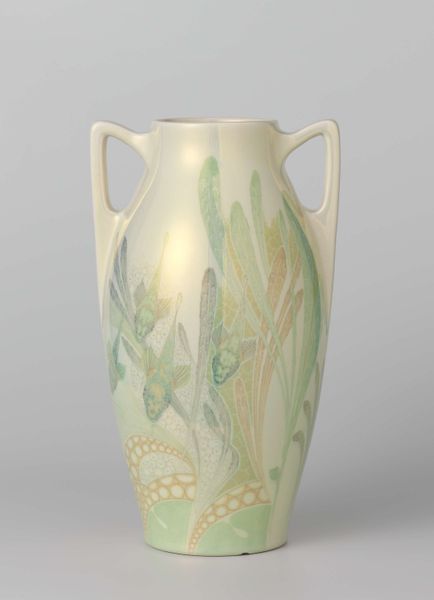 Editor: Right now, we’re looking at a glass vase crafted by Louis C. Tiffany sometime between 1893 and 1896, and held in the collection of the Metropolitan Museum. There’s an ethereal quality to it—an opalescent surface shimmering with pastel shades. How do you even begin to interpret something this dreamlike? Curator: Ah, Tiffany's magic. Forget utility for a moment, and imagine this: You’re wandering through a moonlit garden, the air thick with floral perfume. What does it feel like? This vase captures that fleeting moment. Tiffany wasn't just making decorative objects; he was bottling atmosphere. Editor: It really does evoke that feeling. Those swirling, elongated shapes... Are they supposed to be specific flowers or just abstract forms? Curator: That's the delicious ambiguity, isn't it? The Art Nouveau movement rejected the rigid structures of the past. So, maybe they're flowers, maybe they’re just echoes of them. Tiffany used iridescent glass – he called it "Favrile" – to mimic the way light plays on natural surfaces. It’s not just about what you see, but how the light dances on it. Does that light conjure any thoughts? Editor: I think it’s about capturing a transient, sensory experience, an atmosphere... rather than pinning down something concrete. Curator: Precisely! And, doesn’t that invite you into its spell, even now? What began as decoration has evolved into an imaginative world where we can ponder the limits of perception and inspiration. Editor: I hadn’t thought of it that way, as a sort of self-contained, alternate reality almost. I appreciate how Tiffany used these subtle techniques to really conjure that kind of experience. Curator: My pleasure. It is a joy to ponder the magic that great artists create.