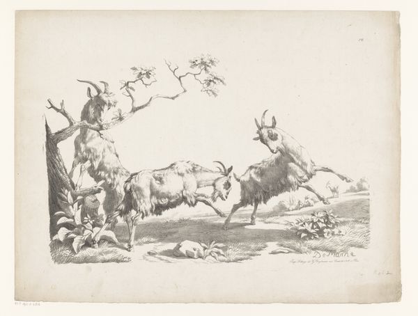 This is a Dutch etching of goats and bucks, made by an anonymous artist. While we don't know for sure when it was made, the naturalistic style suggests that it was done in the 17th or 18th century, a period of increasing interest in the natural world. The print presents three studies of goats in different poses. In each, the goats are rendered with careful attention to their anatomical details and the texture of their fur. The artist shows a clear interest in representing the animals realistically, yet there's a sense of idealization, evoking a harmony between humans and the natural world. The rise of landscape painting and natural history illustration during this period was closely tied to the social and economic changes sweeping through the Netherlands, particularly the rise of a wealthy merchant class with a taste for the finer things. To understand it better, one might want to study Dutch Golden Age society, exploring topics like animal husbandry and the symbolic meanings that certain creatures acquired through folklore. The study of art history is inseparable from the study of social history.