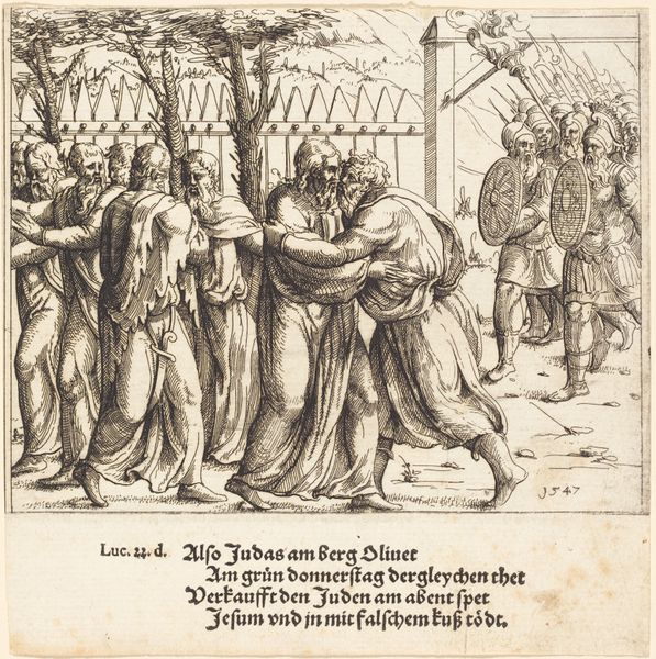 Editor: So, this is Augustin Hirschvogel's "Absalom Slain by Joab," an engraving from 1548. It's small but incredibly detailed! It feels very dramatic and action-packed. What do you see in this piece? Curator: Ah, Hirschvogel! He knew how to tell a story. Immediately, my eyes are drawn to the chaos, the swirling lines almost vibrating with tension. Can you see how the artist used the line work to emphasize the frantic energy of the scene? There's a rawness that really draws me in. Editor: Yes, especially the contrast between the frantic horses and Absalom who's...sort of stuck? Does his being stuck in the tree have symbolic meaning? Curator: Absolutely! Think of it as a visual metaphor. Absalom's ambition, his desire to usurp his father David, has literally caught him. It’s poetic justice visualized! The tree becomes a symbol of divine intervention. Have you noticed how Hirschvogel depicts the soldiers, their armor and weapons almost blurring into a single, relentless force? Editor: Now that you mention it, the horses and soldiers seem almost inhuman compared to Absalom's...almost serene expression? It is a very interesting artistic choice, what do you think it suggests? Curator: Intriguing, isn’t it? Perhaps a reflection on the fleeting nature of power, how easily one can fall from grace. I am particularly drawn to the vulnerability. And, the detail he manages with just lines! It's remarkable, wouldn't you agree? Editor: I do. Thinking about the level of detail that engravings can offer really highlights how much storytelling an artist could include within these parameters. I'll certainly look at engravings differently from now on! Curator: Excellent, because I certainly find that art is something we return to because each viewing brings new knowledge, new emotional resonance.