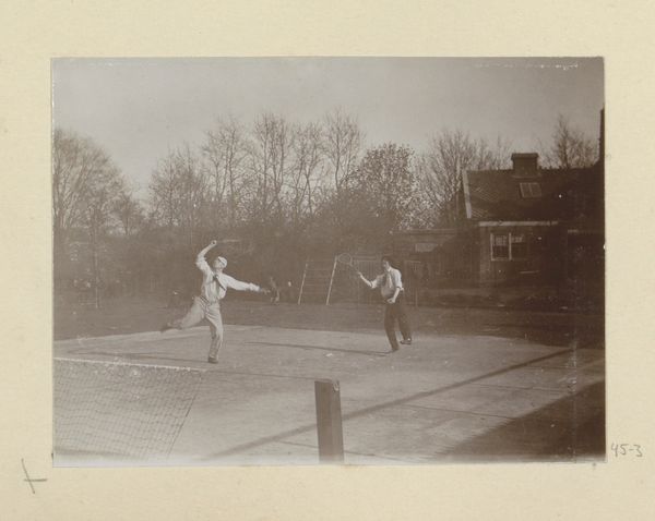 This photograph by Hendrik Herman van den Berg captures four people playing tennis. The sepia tone suggests a historical context, likely the early 20th century, when photography was transitioning from a scientific process to a form of artistic expression. Van den Berg likely employed a gelatin silver process to create this image, where a light-sensitive emulsion of silver salts is coated on a film base. This method allowed for shorter exposure times, freezing the action of the tennis players in mid-swing. The level of detail gives us a sense of the scene, from the texture of the court to the players' clothing. But what does this image tell us beyond its surface? Tennis itself was becoming increasingly popular at this time, and it was tied to notions of leisure, class, and social status. Photography was becoming democratized, and this photo offers a glimpse into a moment of leisure, while inviting us to consider the social dynamics at play.