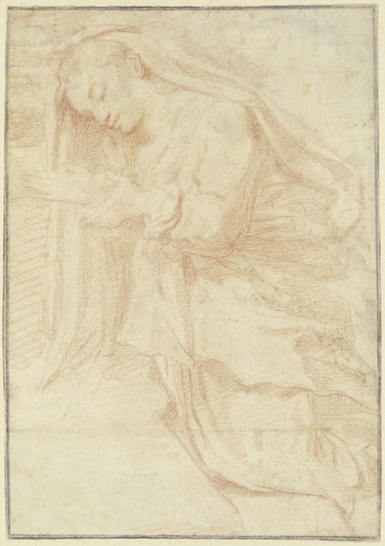 Anthony van Dyck rendered this study of a Madonna in chalk, a medium allowing for delicate tonal variations that evoke a serene and ethereal quality. The composition directs our gaze upward, mirroring the Madonna's own reverent vision. Van Dyck masterfully uses line and shadow to convey depth and emotion. The lines vary in thickness, creating a dynamic interplay between form and light. Notice how the shadows cast by the drapery subtly sculpt the figure, adding volume and a sense of presence, while the upturned gaze introduces a narrative element, inviting contemplation on themes of faith, devotion, and transcendence. The unfinished quality of the sketch opens a dialogue between the artwork and its audience, and the Madonna seems to emerge from the very material of the paper. The study invites us to consider the interplay between artistic process, aesthetic form, and the enduring spiritual themes it seeks to represent.