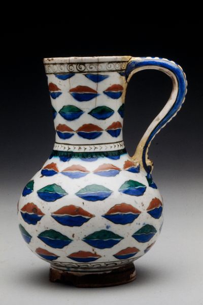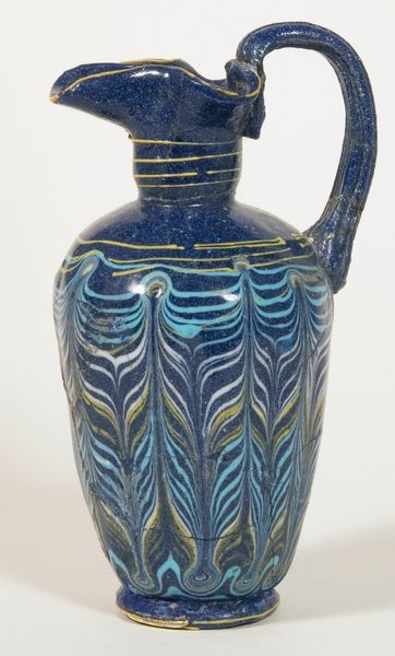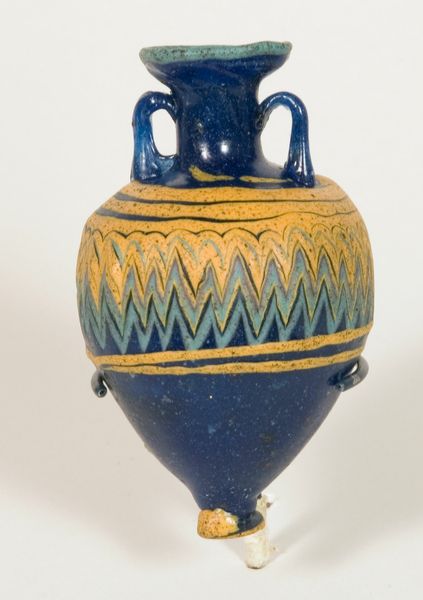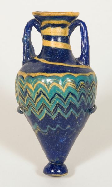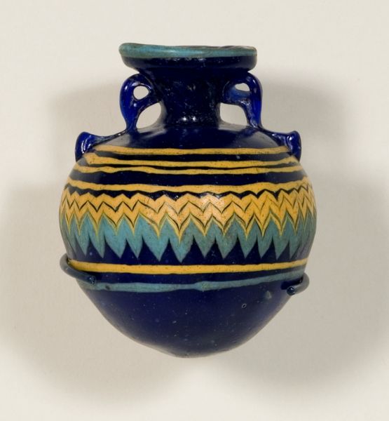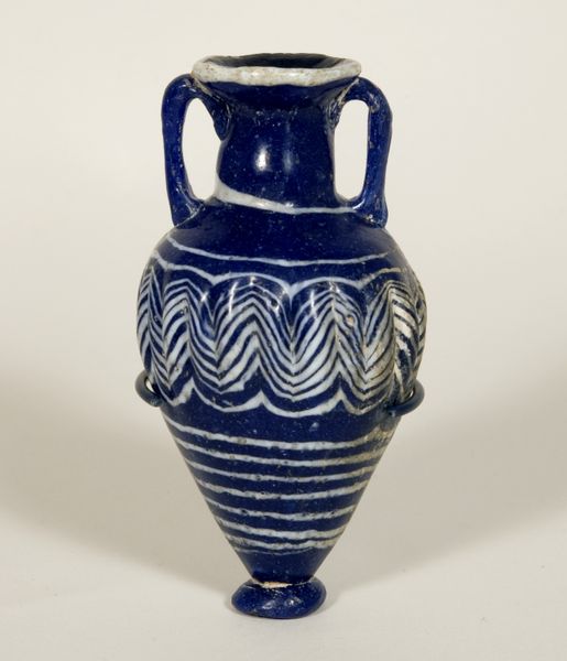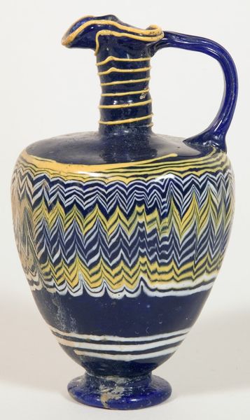 Editor: Here we have an Amphoriskos, or Container for Oil, crafted around the mid-2nd century in the Ancient Eastern Mediterranean. It's glass, beautifully decorated with these horizontal stripes and wavy lines. It strikes me as both functional and quite elegant. What do you make of it? Curator: Well, looking at this object, it is hard not to think about the political economy of the Roman Empire and the trade routes that enabled such luxury items to circulate. Imagine this piece on display in a wealthy Roman villa. Editor: The colours do suggest something luxurious, like something prized. Curator: Precisely. Its aesthetic qualities, such as the layering of glass and striking colour palette, were accessible only to those with means, signifying status and taste. This, of course, affects how we, in the present, perceive this "Container for Oil". Do you see it as "just" an everyday object? Editor: No, not really. I mean, knowing it was for oil but designed with such care elevates it. It also makes me wonder, who was making these? What did their lives look like? Curator: An excellent question! Often these artisans remain anonymous to history, which reflects their lower social standing. Consider also how objects like this gain value as they're displayed in museums. They become symbols of ancient craftsmanship and culture. Editor: That's a good point. We often divorce these objects from the everyday life they came from when they're put on display. It becomes something entirely different. Curator: Exactly. What begins as a container is re-imagined as art. Editor: Thanks. I’ve learned a lot about how historical context transforms the object and affects its legacy.