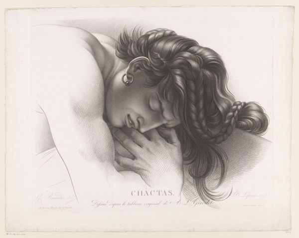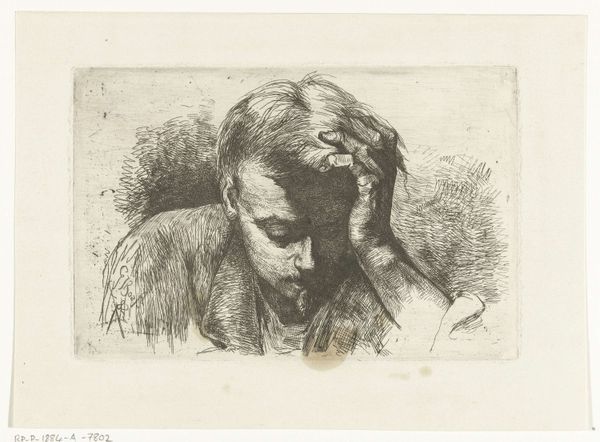 Curator: Louise-Rosalie Hémery’s "Den forvirrede pige," or "The Confused Girl," made between 1775 and 1779, arrests me every time. There's a kind of fragile intensity, isn't there? Editor: Absolutely. Immediately, I'm struck by how delicate yet precise the etching is. You can see the traces of labour, the layered hatching built up using printmaking, resulting in this almost hyperreal representation. It makes me wonder about Hémery's role as an etcher within the production. Curator: It whispers volumes, doesn’t it? That's Rococo for you, presenting potent drama within seemingly light confections. The headwear signals domesticity, innocence perhaps, yet the hand presses against her temple, eyes downcast— a world of emotion crammed into a few square inches of paper. Editor: And it is that very 'paper' which carries the weight of Hémery’s production. She’s not merely producing for high art, she's employing the craft and materials to make something immediate, and, dare I say, confrontational within the visual vocabulary of the time. Where did Hémery situate her works in the context of art-making in 18th-century Denmark? Curator: You hit on a key aspect! Hémery's choice of print, with its ability to democratize art through multiples, speaks volumes. We have what feels like a fleeting moment—a psychological portrait rather than a commission of wealth or status. The material shifts the very purpose of the art itself. Editor: Indeed. Even in the application of her skill – notice the subtle yet determined use of sepia ink against the stark, white page; and in those fine, determined strokes there exists not only mastery but accessibility, providing the social and historical value to that scene that would remain locked within wealthy portraits of the period. Curator: It leaves me contemplating what those private confusions were, or might be, across those silent centuries. To make work that makes the viewer feel, no matter when they are seeing it – that is something really special. Editor: Yes, by layering those materials with intimate and confrontational gestures, Hémery encourages her audience to contend with what art could do, as much as what it is representing, it challenges that very premise.