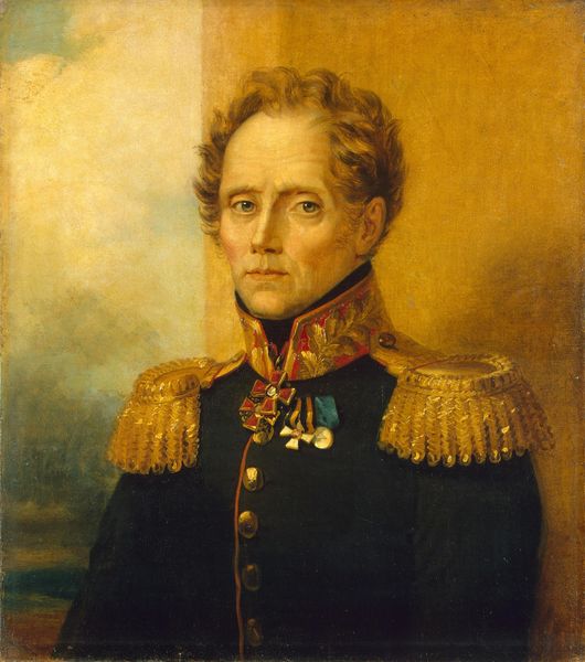 Curator: This oil painting presents Mihail Nikolaevich Macnev, a Russian General. It is on display here at the Hermitage. What do you make of it? Editor: He has an air of stoicism. The tight-lipped expression, combined with the ornate uniform and almost hazy background, gives him an almost otherworldly appearance. Curator: Dawe’s portraits like this one were often created to immortalize figures prominent in Russian society. Examining the portrayal of military leaders allows us to analyze the militaristic values and power structures of the time. How were masculinity and leadership visually constructed through pieces like this? Editor: Precisely. It would be interesting to consider this alongside theories of power. This portrait reinforces the social hierarchy. He is presented as an almost unreachable figure due to his elevated position. The subject's power becomes performative through medals, epaulets, and a stern expression, shaping his constructed identity within society. Curator: Absolutely. Furthermore, understanding the creation and placement of art during this era enables us to discern the sociopolitical climate, highlighting institutional values, and dominant political imagery of Imperial Russia. Editor: What strikes me is the potential for this piece to become more than just a commemoration. Can the portrayal of Macnev resonate with individuals experiencing hierarchical systems? Can his portrayal facilitate understanding how gender expectations can influence and limit a person's identity? It invites examination of these ideas and how history and society interact. Curator: Considering art through such intersectional lenses allows us to appreciate historical figures, prompting introspection on their legacy, particularly for present audiences examining power dynamics. Editor: Indeed, and ultimately, it becomes a vibrant forum for interrogating the ongoing interactions of history, representation, identity, and societal dynamics.