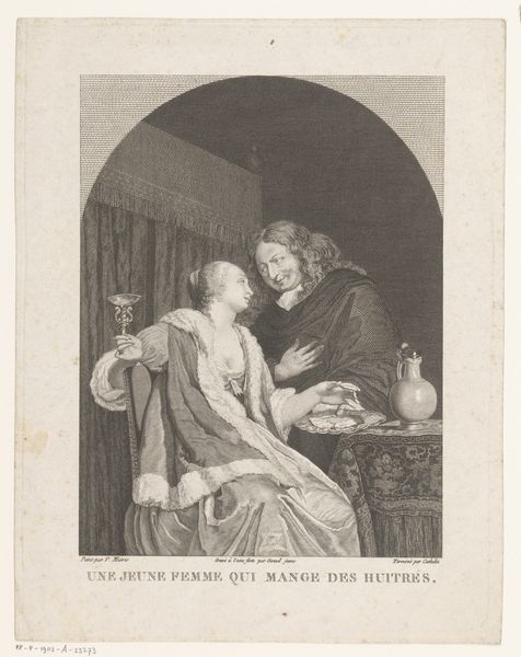 Paul Gavarni's etching captures a domestic scene charged with dramatic tension, likely made sometime in the mid 19th century. The man's exaggerated gesture, pointing outward with intense emotion, is a performative display, perhaps undercut by the woman’s seeming indifference in the background. This gesture, reminiscent of classical orators and theatrical actors, has roots stretching back to ancient Greece and Rome, where rhetoric was a highly valued art. Think of the raised hand of a Roman senator, or a figure in Renaissance paintings using emphatic gestures to convey power or persuasion. Over time, this motif has been adopted, adapted, and even parodied, reflecting changing cultural attitudes toward authority and expression. Here, Gavarni employs the symbol to subtly mock the man's self-importance. The echo of historical grandiosity clashes comically with the mundane setting of the home. This juxtaposition touches something deep in our collective psyche. We recognize the innate human desire to be seen and heard. And perhaps, the simultaneous fear of not being taken seriously. Gavarni’s image thus becomes a mirror reflecting our own complex relationship with performance, authenticity, and the search for meaning in everyday life.