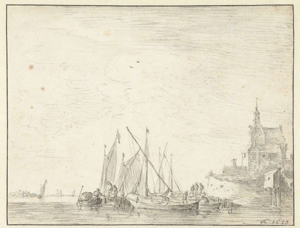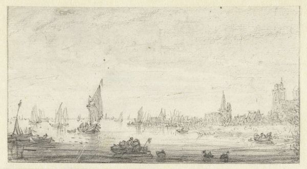 This is a river landscape with sailing ships, created by the monogrammist FB in the Netherlands. The print masterfully uses etching to create a balanced composition, contrasting areas of dense, detailed lines with open, lighter spaces. The foreground is marked by the intricate depiction of figures and vegetation, gradually leading the eye toward a serene body of water dotted with sailing ships. On the right, architectural elements perch atop a craggy hill. The sharp, precise lines define the forms of the buildings and the billowing sails. The artist's use of line and texture not only depicts the physical qualities of the landscape, but also invites contemplation on the relationship between humanity and nature. Through the structural interplay of these elements, the print invites us to ponder the themes of exploration, settlement, and the passage of time. The work becomes a site for ongoing visual and intellectual discovery.