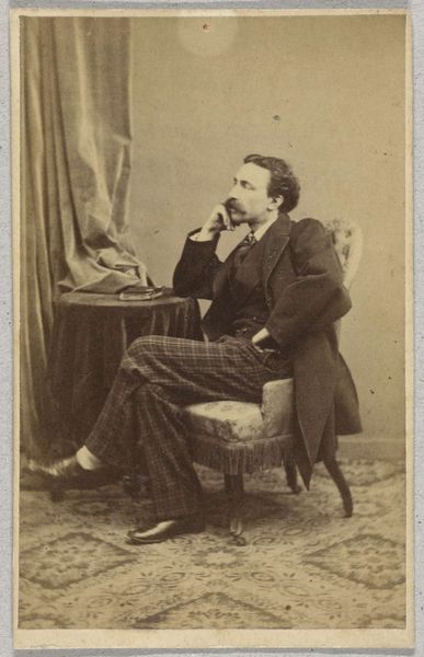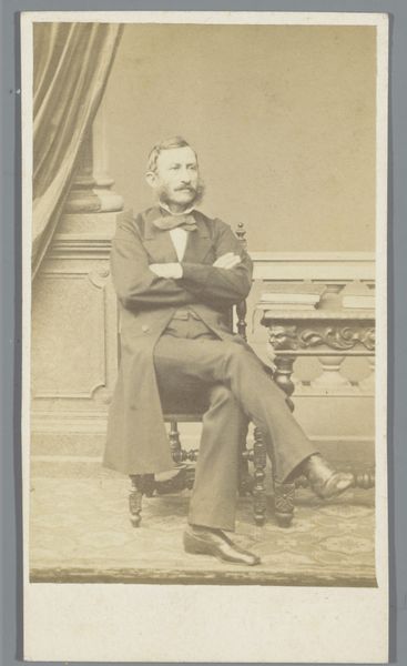 Editor: Here we have "Portret van Salomon Leonardus Verveer," a gelatin-silver print from somewhere between 1861 and 1876 by Maurits Verveer, residing in the Rijksmuseum. I'm immediately struck by its stillness and formality. What can you tell me about it? Curator: This piece allows us to examine the evolving social function of photography in the mid-19th century. Portraiture, previously the domain of painting and accessible primarily to the wealthy, was becoming more democratized through photographic processes. How do you think this impacted the perception of portraiture itself? Editor: Well, if paintings often served to idealize or monumentalize a person, then a photograph might have offered a more immediate and perhaps 'truer' likeness, though that's complicated by posing and choices about the setting. Curator: Exactly. This raises interesting questions about authenticity and representation. Photography provided a new kind of visual authority, shaping perceptions of individuals but also reinforcing or challenging social hierarchies. The sitter, Salomon Verveer, was a known painter in the Hague. Why commission a photograph? Was photography overtaking painting? Editor: Maybe, like, to reach a new audience, or, thinking about history, to leave a visual record with wider accessibility? Curator: Precisely. It reflects photography's expanding role in shaping public image and preserving memory, marking a significant shift in art and society. Editor: I hadn’t really considered photography as an instrument of social change in that way. I was caught up in the, you know, aesthetic. Curator: Thinking of art within social, cultural, and political movements provides new pathways for interpretation and challenges pre-conceived notions about the trajectory of visual imagery. Editor: Thanks! That's really changed how I see not just this photograph, but portraiture, broadly.