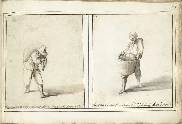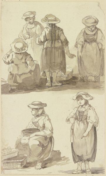 Editor: We're looking at "Mannen en vrouwen met verschillende beroepen," made sometime between 1769 and 1789 by H. Partout. It’s a pen and pencil drawing on paper, depicting what seems like different professions, with light shading to create shape. It’s really charming! What do you notice about its formal qualities? Curator: The sheet is organized as a grid, but notice how each figure is contained within its own implied square, a formal device that isolates them for consideration. How does this structured repetition of form affect your viewing experience? Editor: I think it makes me consider them almost like specimens, examples of types, more than individual portraits. Curator: Precisely. The figures' gestures, and the objects they hold, direct our sightline within these contained forms. Consider the man with his hat extended, juxtaposed with the figure to the lower left. Observe the orientation of the open hand as it mirrors his posture, almost forming a dialectic relationship between them. What impact does that symmetry achieve, do you think? Editor: I see what you mean about the gestures echoing. It’s like there’s a conversation between them even though they're separated. It kind of gives them each more weight, somehow. It elevates them past basic documentation. Curator: And note how the light pencil work enhances the linearity of the pen strokes, lending itself to clear figuration while simultaneously reminding the viewer that this image exists in only two dimensions. Editor: I hadn’t thought about the flat perspective so much! So even with the detailed figures, it’s really focused on the line and the design of the page overall. Curator: Indeed. And this concentrated design adds an unexpected layer of richness. Editor: I learned so much. The idea of figures mirroring each other and echoing through poses to build greater connections across an organized tableau feels really insightful. Curator: Analyzing form gives you the ability to have these insights, and it reveals so much about how an artwork achieves its effects.