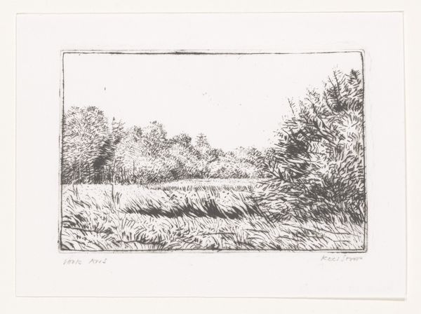 Curator: My first impression is how delicately this scene has been rendered. The hatching and cross-hatching creates a surprising luminosity for what seems like a gray, overcast day. Editor: This work, "Canal with Boat," is an etching by Arnoud Schaepkens, created sometime between 1831 and 1888. Etching as a medium has long been associated with democratized image production, its relative affordability opening access to printmaking, though technical mastery was a tightly controlled process. Curator: The artist’s skill with line work is evident; he truly makes the water and surrounding foliage come alive. Observe how the dense, dark vegetation at left sharply contrasts with the reflections in the water, and the lone figure in the boat with a fishing rod, which directs the eye back into the landscape. Editor: Looking at it in that way, one considers that landscape wasn't merely observed by the artist, but something constructed and worked upon. This canal, then, embodies labor, reshaping nature for transport, for commerce. And this work's materiality—the zinc or copper plate, the acids used in its creation—speak to industrial development in the 19th century, and how art functioned within circuits of exchange and value. Curator: An interesting point. However, consider the way the artist contrasts this utilitarian canal with areas of dense overgrowth in what is essentially a study in textures, from rough bark to still water, giving us both naturalistic depth of the forest meeting the man-made straight edges of the water-way Editor: True, and in its subdued tones, perhaps we can see it as emblematic of quiet, 19th-century leisure, reflective of an aspiring bourgeois sensibility that seeks solace from increased industrial labor through a return to "nature". This aestheticized rural setting becomes a space to play out new class dynamics and ways of seeing oneself within the natural landscape. Curator: In closing, “Canal with Boat” demonstrates the capacity for modest lines on paper to stir compelling emotions of tranquil rural scenes. Editor: Indeed, and it makes one appreciate the labor behind its production and the material conditions that birthed this perspective, making the viewing experience infinitely richer.