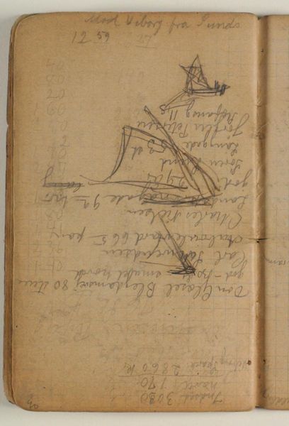 Curator: Let’s turn our attention now to Niels Larsen Stevns’ “Loose Sketches and Addresses,” a pencil drawing on paper created around 1906. What strikes you first about it? Editor: The immediacy. It feels like a direct glimpse into the artist’s mind, unfiltered and raw. The sketchbook quality and the combination of text and image offer such intimacy. Curator: Precisely. We’re looking at the material remnants of Stevns’ artistic process. Note the support: common squared paper. The artist isn't precious, which complicates that separation of craft and “high art" you see so often during this period. This isn’t about creating a pristine gallery piece, but about exploring the landscape and jotting down notes and addresses simultaneously. Editor: Absolutely, and I see the political and social context seeping through, too. He's recording data alongside his drawings: quantities, addresses... It all speaks to a world undergoing rapid industrialization and bureaucratization. Are these possibly commissions or landscapes containing social commentary? It prompts a question about the function of art in a changing world. Curator: Possibly. Or, as he moved through the world and found inspiration he captured those details in the same instance he captured logistical and navigational considerations. This would be typical for artists of his milieu who traveled by foot or coach and thus combined these practicalities into a singular object, something more integrated and sustainable than current day. Editor: I also think the sketches themselves evoke a sense of fleetingness. The boats hint at travel, trade, colonialism. Everything feels temporary and mobile which would influence Stevns's art whether intentional or subconscious. Curator: Good points. There is definitely that dialogue happening on this page, in microcosm. I see materiality, process, lived experience informing Stevns' creative choices and our viewing experience, today. Editor: Exactly. And for me, it becomes about acknowledging these sketches not just as beautiful or historically significant but as reflections of the dynamic historical moment which continue to resonate today, reminding us to consider art's positionality and accountability.