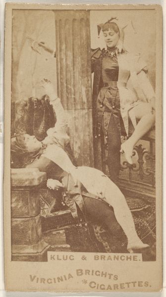 Editor: Here we have “Card Number 755, Miss Perichol,” part of the Actors and Actresses series from the 1880s, printed by W. Duke, Sons & Co. as a cigarette card. The sepia tones give it a nostalgic air, and the scene, while clearly staged, feels surprisingly intimate. What stands out to you in this portrait? Curator: Oh, the lure of the Gilded Age! What enthralls me most is the layered artifice at play. Here's Miss Perichol, a stage persona captured on a tiny card designed to sell cigarettes. Is it a photograph, a drawing, or something in between? Does that matter? The backdrop is a painterly nod to classicism, yet it feels distinctly modern in its commodification. Notice, too, how her languid pose borrows from both high art and, perhaps, more…scandalous imagery. Editor: Scandalous how? Curator: Well, cigarette cards often traded on veiled eroticism, didn't they? The glimpse of leg, the dreamy expression, all subtly pushing boundaries. Japonisme also seems present in this work – how do you perceive it? Editor: I didn’t catch that at first! Maybe the stylized background or her almost theatrical pose? Curator: Exactly. Think of the Japanese prints that were all the rage then—flat perspectives, decorative patterns, the blurring of lines between reality and performance. Miss Perichol is posing, not just for the camera, but within a whole tapestry of artistic and commercial influences. I wonder if she ever pondered her image plastered on these cards! Editor: It really makes you consider the context and the multiple layers of meaning behind what appears, at first glance, to be a simple portrait. I’ll certainly be looking at cigarette cards differently now. Curator: Exactly! A tiny slip of cardboard can open up a whole world.