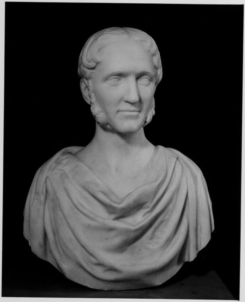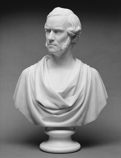 Curator: This is H.W. Bissen’s marble bust of National Bank Director L.N. Hvidt, created in 1865. Editor: Immediately, I am struck by its imposing stillness, that serene gaze, a composition of immense poise. What a masterful execution of realism in stone. Curator: Indeed. Bissen was a key figure in Danish Neoclassical sculpture. The purity of line and form adheres to this classical ideal. Note the deliberate containment—the closed composition, directing our gaze solely to Hvidt’s face. Editor: But there is something distinctly bourgeois, or perhaps, civic minded here. The slight turn of the head conveys approachability; there is an intimation of character—experience—in the furrowed brow. This isn't just about ideal beauty, it's about depicting a public figure. Curator: Precisely. The realism, tempered by classicism, serves to ennoble Hvidt while retaining his individuality. Consider the handling of drapery, just a hint, merely implied—enough to suggest status, without ostentation. A powerful demonstration of controlled detail. Editor: This echoes, in many ways, Roman portrait busts, capturing dignity, but also implying civic virtue. In antiquity, the display of ancestors' busts were tied to status and respectability. Placing Hvidt in this artistic lineage subtly hints at his important role in society. It is interesting how he has become ennobled by virtue of being a patron of the arts, rather than of royal blood. Curator: Certainly. The careful balancing of realism and idealisation, it creates a fascinating tension, a play of contrasts that ultimately speaks to Bissen's sophisticated understanding of sculptural form and societal portrayal. The bust stands as a remarkable synthesis. Editor: In the end, more than stone, this work speaks of status, societal position and enduring legacy. A portrait of a man, but also an epoch in transformation.