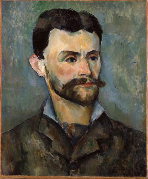 Editor: This is Amedeo Modigliani's "Leopold Zborowski with a walking stick," painted in 1917 using oil paint. The flattened planes of color and elongated features give it a somewhat haunting quality. What do you see in this portrait beyond the surface? Curator: It's crucial to view this painting within its historical context. Modigliani painted this during a period of immense social upheaval. Consider the weight of the walking stick Zborowski holds – is it merely a support, or does it symbolize something more? Perhaps the precarity of existence, especially for Jewish intellectuals in a climate of rising nationalism and anti-Semitism. Editor: That's a perspective I hadn’t considered. I was so focused on the artistic style. How does Zborowski's identity, both as a poet and art dealer who supported Modigliani, shape your reading of the work? Curator: Zborowski was more than just a subject; he was a key figure in the avant-garde art scene. His support allowed artists like Modigliani to create, challenging traditional norms. This painting becomes a document of their intertwined destinies and their shared resistance to the dominant artistic and political forces. The almost mask-like quality of the face obscures details. Could this be read as a kind of protection, a deliberate veiling against hostile gazes? Editor: So, it's not just about artistic representation, but also about the complex power dynamics and social anxieties of the time. It feels like the portrait is actively resisting easy interpretation. Curator: Exactly. Art is rarely created in a vacuum. Examining the intersecting narratives of artist, subject, and socio-political climate unveils the deeper layers of meaning. It becomes a site of ongoing dialogue and resistance. Editor: I see the portrait so differently now, as a historical and political statement as much as an artistic one. Thank you.