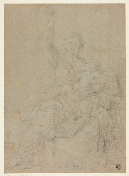 Curator: Ah, the textures, almost tickling your eyes. It's like staring into a reverie, no? Editor: Indeed. Here we have "Madonna and Child enthroned in clouds", a pencil drawing on paper by Giacinto Calandrucci, dating roughly from 1646 to 1707. Curator: It's a Renaissance echo, this drawing is. All billowing clouds and gentle gazes. Makes me think of lullabies sung in hushed rooms. Editor: Absolutely. You see, Calandrucci was very much working within established iconographic traditions. Consider the era, and how the church was, shall we say, fond of certain imagery, and controlled what artwork looked like in society. It is an Italian Renaissance piece, steeped in familiar imagery. Curator: That Madonna’s gaze… it feels both serene and distant. It's like she's simultaneously present with the child, and a thousand miles away contemplating some cosmic equation. Editor: One can imagine that distance representing a divine contemplation beyond human understanding, in those turbulent political times for Italian religious views and patronage. Notice how the soft gradations of the pencil create depth within what would otherwise be a rather straightforward composition. Curator: And the child… a tiny sovereign already, hand raised in what seems a silent benediction, it brings a lightness, which perhaps provides some sense of humanity amongst that powerful display of clouds! It's sweet, like a cherubic burst of mischief amid the grand theological statement. Editor: Yes, I think it's fair to say Calandrucci gives us access to something relatable, within very specific art making frameworks, for very powerful institutions. Curator: Thinking of how this image has landed, with this conversation... Makes you consider art through the ages, it doesn't exist in a bubble but as part of ongoing creative exchange, something so touching about seeing it afresh, today. Editor: Agreed. Examining art from different points is helpful, this piece speaks volumes, not just about religious themes of the 17th century, but about the ever-shifting dialogue that art has with power, perception, and, most importantly, people.