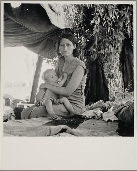 Curator: This is an untitled photograph by Dorothea Lange, held in the Harvard Art Museums collection. It portrays a woman with a bonnet and children. Editor: The first thing that strikes me is the sheer weight of it, you know? The woman's expression, the baby in her arms...it feels heavy, burdened. Curator: Lange often used the mother and child archetype to evoke universal feelings of compassion, but also to symbolize resilience amidst hardship. Think of the Madonna figure. Editor: Absolutely. And that bonnet, framing her face like a halo almost...but a halo of struggle, not serenity. It's a powerful juxtaposition. Curator: It's interesting how Lange focuses on the subtle details, the textures of their clothing, the lines on the woman's face, all speaking volumes about their circumstances. Editor: It makes you wonder about their story, doesn't it? Where they're going, what they've been through. It's a snapshot of a life, frozen in time, yet somehow still breathing.