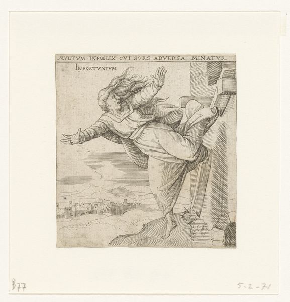 Curator: Here we have "Faam," an engraving dating from 1533 to 1567, attributed to the hand of Enea Vico. It's currently part of the Rijksmuseum's collection. Editor: Well, isn't that something! My first thought? Loud. Brash even. She’s practically shouting with that trumpet, a bit like my upstairs neighbor, actually. Curator: Indeed. Notice how Vico has rendered Fame as a winged figure, traversing the landscape with haste. Consider the lines, the intricate detailing, and the textures he has achieved through the engraving process. Semiotically, the trumpet serves as a signifier for pronouncements, broadcasting news both good and ill across the world. Editor: Absolutely. The way she’s striding forward gives a real sense of urgency. But look closer—there’s something slightly…off. A tad unbalanced maybe? The figure seems almost too large for the landscape behind it. Makes me think about how rumor and exaggeration often distort the truth, looming large over reality. Curator: A pertinent observation. This slightly disproportionate element aligns neatly with Mannerist sensibilities, where distortion and exaggeration are frequently deployed to provoke a heightened emotional response. Also note the Latin inscription—"Voce, oculis, alis, toti svm cognita mvndo" -- "By voice, by eyes, by wings, I am known to the whole world." Editor: Right, because rumor spreads fast, seen and heard, it's everywhere. She really is working hard spreading the news...wonder what she's yelling about. All those details in the fabric, the tiny figures on the hill...It gives it the feeling that something significant happened, but we only see it from afar. As the viewer, we don't ever fully know all the facts! Curator: Precisely. The artwork functions as an allegory. Fame herself—*Faam*—serves as the personification of reputation, public opinion, and, of course, notoriety. Editor: That's fascinating, putting a face and wings on something so intangible, and also volatile as news...the perfect piece for thinking about how gossip travels. Curator: It invites reflection. It showcases, simultaneously, the skill of Vico as printmaker. Editor: Definitely a piece that has stuck with me...lots to chew over about that dame!