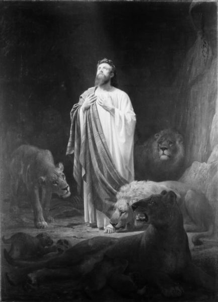 Briton Riviere made Daniel's Answer to the King with oil paint, a traditional art material that allows for rich colors and smooth blending. But it is more than a painting about religion. Consider the amount of labor involved in the production of this image. First, the manufacture of oil paint itself, with pigments ground by hand. Next, the skilled labor of the painter Riviere. Notice the way that he uses the material of paint to create a specific mood. The dark palette is rendered with blended brushstrokes to highlight the dramatic tension of the story, and the artist uses color and light to create a compelling and emotive tableau, with particular attention to the accurate depiction of the lions' anatomy. Through careful application of this process, the scene is imbued with a sense of drama and suspense. Remembering the materials and methods by which art is made reminds us not only of the artist’s skilled labor, but of the wider social context of artmaking itself.
