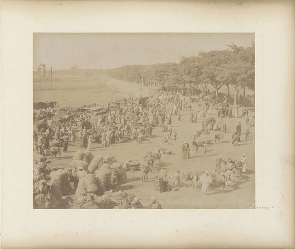 Curator: This gelatin silver print captures Brighton Beach in its Victorian heyday. The photographer is credited to W.M. Spooner & Co., and the image is dated circa 1880 to 1910, a truly fascinating snapshot of the past. Editor: Immediately, I'm struck by the density of the composition. It's a real study in texture, with the pebbled beach and all those tightly packed figures and architecture fighting for space in the frame. Curator: The density you point out reflects the burgeoning seaside tourism industry of the late 19th century. Coastal towns like Brighton became magnets, accessible by train and offering leisure opportunities to a growing middle class. Notice the segregation implied in the bathing machines. Editor: Ah, yes. Those bathing machines speak volumes! From a purely formal perspective, they offer a structured repetition that is only broken by the crowds themselves. Curator: Indeed! These architectural objects reveal how bathing and the public display of the body was heavily policed and segregated, particularly in relation to gender. What looks like carefree leisure was carefully coded and performed. Also notice the clothing of the people on the beach! Editor: Right, and the monochrome medium does a really elegant job emphasizing those tonal qualities and the stark differentiation of shape that their outfits produce, but in a slightly obscured way—making us want to look closer. Curator: This points to photography's power as a democratizing force, capturing the sheer spectacle of a beach teeming with people. In other words, Brighton democratized a space for leisure, and photography democratized its record. Editor: Precisely, the photograph does something a painting could not in that era: provide an ostensibly objective—almost scientific—account of social habits. This view seems very typical of pictorialism, with an emphasis on atmospheric perspective—you could even argue it contains impressionist elements! Curator: I agree, we must remember that photographic production still faced technological hurdles at the time. But this opens up other lines of inquiry: namely the social changes and the historical trends that produced such an image! Editor: True. I hadn’t considered the material constraints… It really does alter my perspective on the work as a whole! Curator: Exactly! Together, those elements begin to shape the artwork's broader implications. Editor: A new reading has revealed new appreciation. Let us leave it here!
