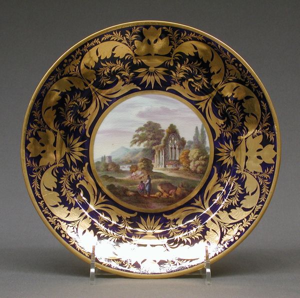 Editor: This saucer, a porcelain piece made by Meissen, features a bustling harbor scene framed in gold. It’s quite small, but the detail is incredible. What strikes you most about this object? Curator: Well, let’s consider Meissen's porcelain itself. It represented a kind of technological and economic power. It was one of the first European manufacturers to master true hard-paste porcelain, breaking China's monopoly. Editor: So the saucer itself is a symbol of shifting economic power? Curator: Exactly. And look at the scene depicted. The very act of producing and consuming such refined wares speaks volumes about social class and colonial trade routes. What do you think? Editor: It makes me see it beyond just a pretty object – it is a product of a specific time and place. Curator: Precisely. Thinking about the material realities unlocks so much.