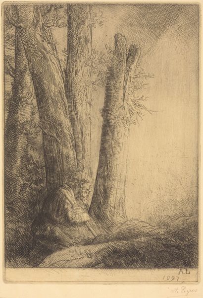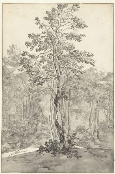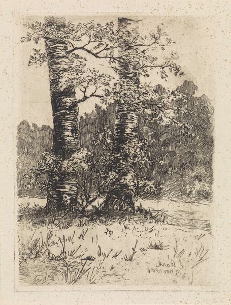This is "Three Tall Trees," an etching made by Cornelis Steffelaar, who lived in the Netherlands during the late 18th and early 19th centuries, a time when Dutch art was shifting away from its historical emphasis on portraiture and genre painting. Here, the artist makes use of a detailed etching technique to create a scene of sylvan nature. The scene is made up of three trees, the central one of which is set further back in the space. These trees take up almost the entire picture plane. It's interesting to note that during this time, art academies in the Netherlands still placed emphasis on traditional landscape painting. Steffelaar may have sought to respond to the market for this type of artwork by producing this etching. We can learn more about the relationship between artists and institutions through careful archival research into the structures that supported artistic production at this time. In this way, we may come to see this simple image as contingent on its specific cultural and institutional context.