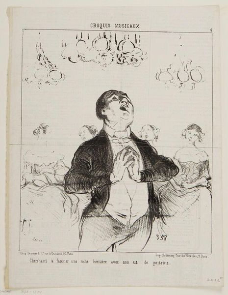 Curator: I'm struck by the drama! It feels so operatic even before I knew it was meant to. Editor: It is indeed. Let me introduce "Cherchant a fasciner une riche…," a lithograph print by Honoré Daumier, created in the 19th century. Daumier was prolific in this medium; using lithography, he captured the essence of Parisian society, focusing here on the construction of the performative self and the pursuit of wealth. Curator: That makes sense. Look at the way the singer throws back his head. And the chandeliers seem almost mocking with their clustered lights like googly eyes fixed upon the stage. There's definitely a satirical edge. Editor: Absolutely, Daumier employed caricature to critique social climbing. The symbolism here is potent: a tenor using his voice – his very self – as currency to “fascinate a rich heiress,” as the inscription suggests. The visual emphasis is on labor transformed into commodity. Curator: The composition supports that, doesn’t it? The sketchy lines denote speed, like a quick journalistic impression, yet also hint at mass production. Think of the infrastructure required to produce and disseminate these prints, placing 'high' art in a wider circuit of capital. What do you read from the women behind him? Are they impressed? Editor: Their faces are quite generalized, aren't they? They might represent society's expectations, watching and evaluating his performance through their ambiguous gazes, or perhaps their wealth provides the stage. The artist gives center stage to an active participant within that social play. Curator: So, this image resonates as a commentary on performativity, aspiration, and social dynamics within the artistic spaces of Paris. Editor: It's a poignant reminder that the pursuit of artistry, then as now, often intersected with complex socioeconomic landscapes. Curator: Indeed, thank you for highlighting how Daumier used these simple means to deliver such pointed satire. Editor: A pleasure! It’s enlightening to explore how meaning is constructed through process and materials, to illuminate art's broader reach.
